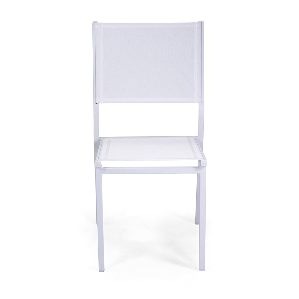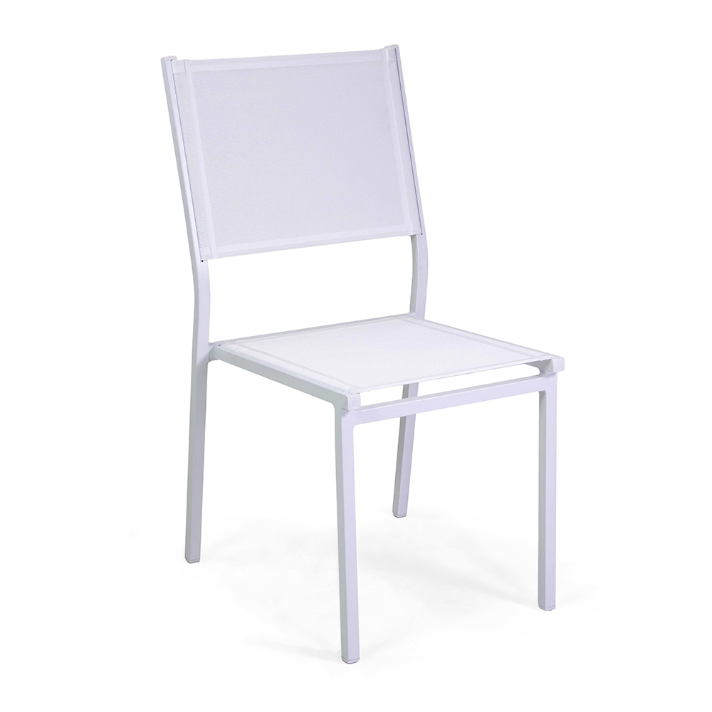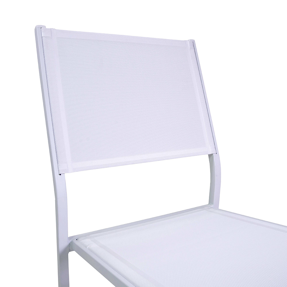 Dieser Stuhl mit weißem pulverbeschichtetem Aluminiumrahmen stellt die ideale Balance zwischen Funktionalität und Stil dar, perfekt für Außenbereiche wie Gärten und Terrassen. Das weiße Textilene verleiht ihm nicht nur ein modernes und elegantes Aussehen, sondern sorgt auch für eine bequeme und wetterfeste Sitzfläche.