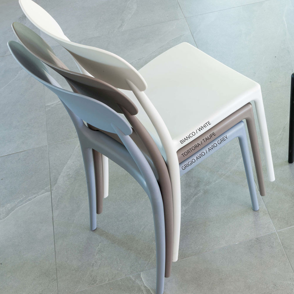 Polypropylen. Dieses Produkt ist für alle gedacht, die Funktionalität mit Einfachheit verbinden möchten. Tatsächlich eignet sich dieser Stuhl perfekt für den Einbau in Wohnbereiche, Küchen und Esszimmer, sowohl im Innen- als auch im Außenbereich, wo alltägliche Familienmomente erlebt werden und wo Praktikabilität von entscheidender Bedeutung ist. Dank der für die Produktion verwendeten Materialien möchten wir dem Kunden ein Produkt garantieren, das nicht nur schön anzusehen, sondern auch hochwertig und langlebig ist