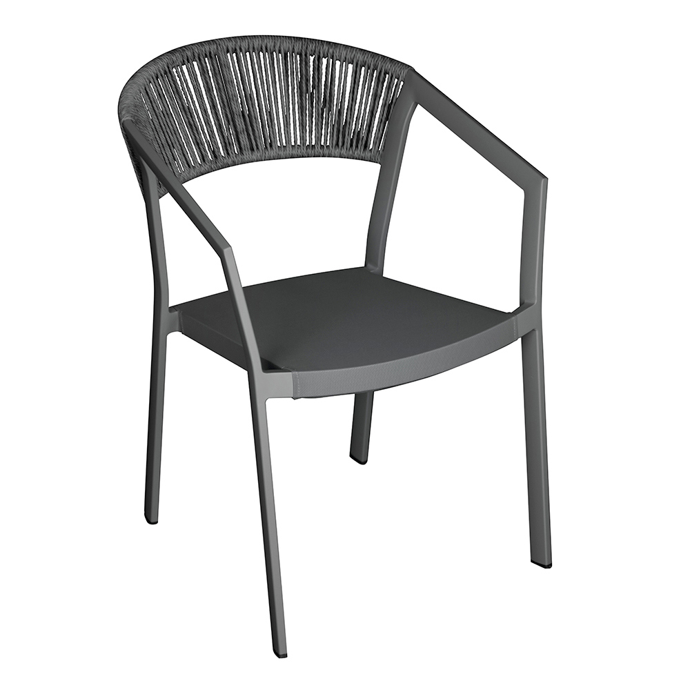 Stapelbarer Outdoor-Stuhl mit Aluminiumrahmen, Rückenlehne aus Twist-Geflecht und Sitzfläche aus Textilene.