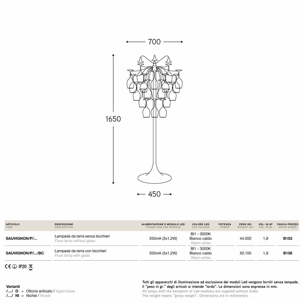 Stehlampe 30 umgekippte Gläser Sauvignon von Aldo Bernardi