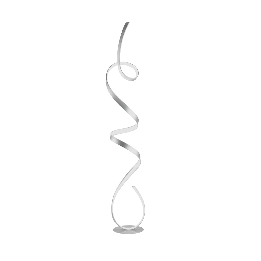 Stehlampe mit silber lackierter Metallstruktur und LED-Licht.
