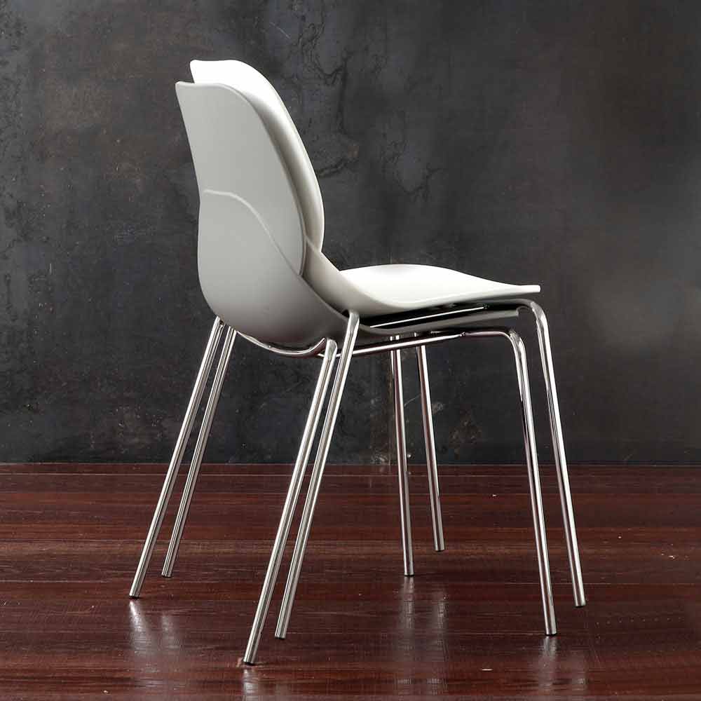 Die Stühle haben ein verchromtes Metallgestell. Sitz und Rückenlehne sind aus Polypropylen hergestellt: Weiß oder quarzgrau RAL 7037