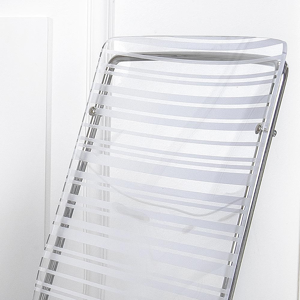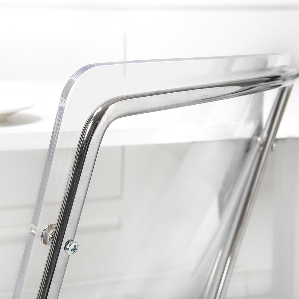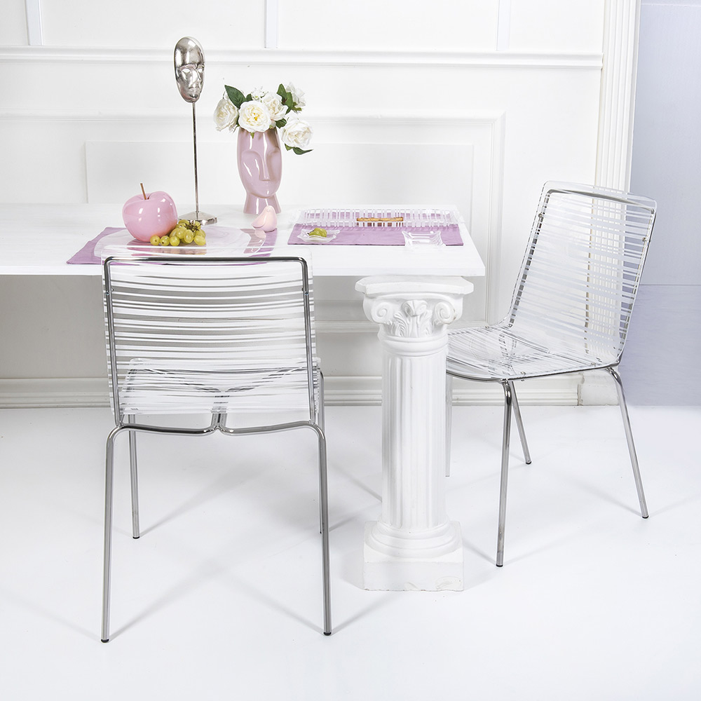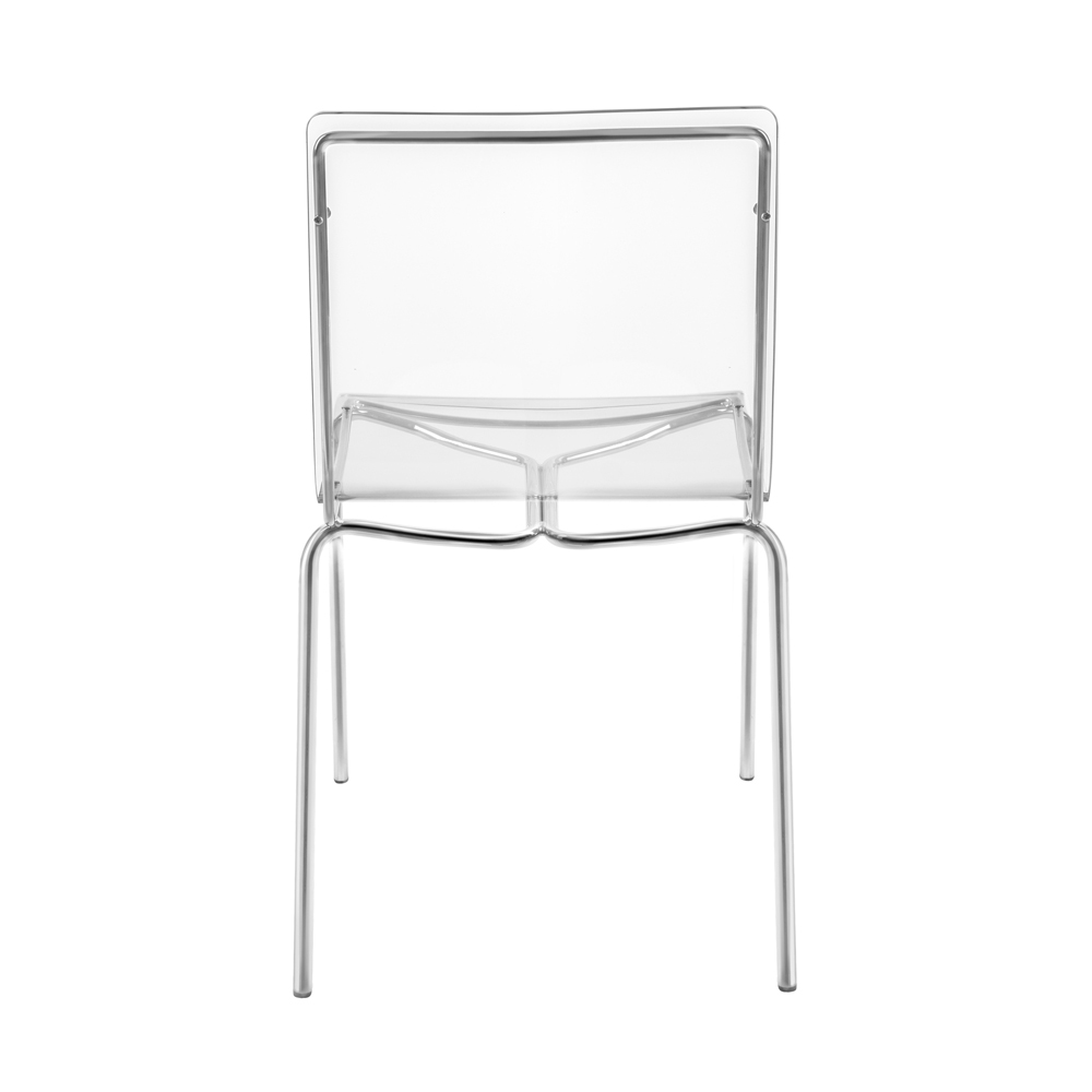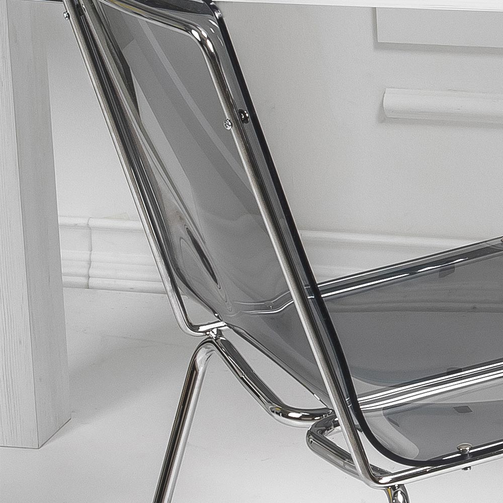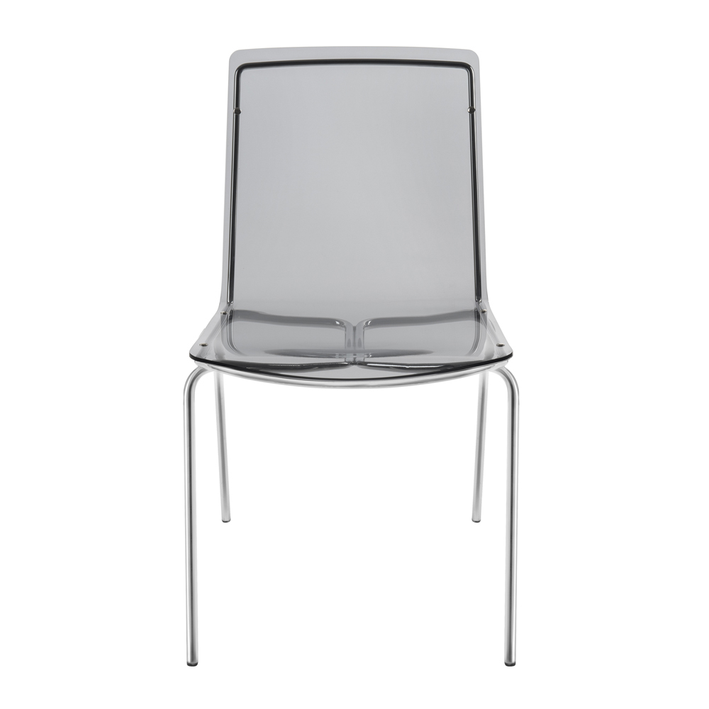Esszimmerstuhl vollständig in Italien hergestellt mit Plexiglasschale und verchromten Eisenbeinen , die ihn auch leicht stapelbar machen. Dieses Möbelstück zeichnet sich durch ein einfaches und klares Design aus und ist vielseitig und zeitgemäß , auch dank der verwendeten innovativen Materialien, die seine geometrische Eleganz unterstreichen.