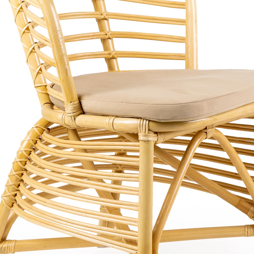 Außenstuhl aus geflochtenem Naturrattan und ausgestattet mit einem Sitzkissen mit Polsterung in der Standard "Stone Beige" Ausführung.