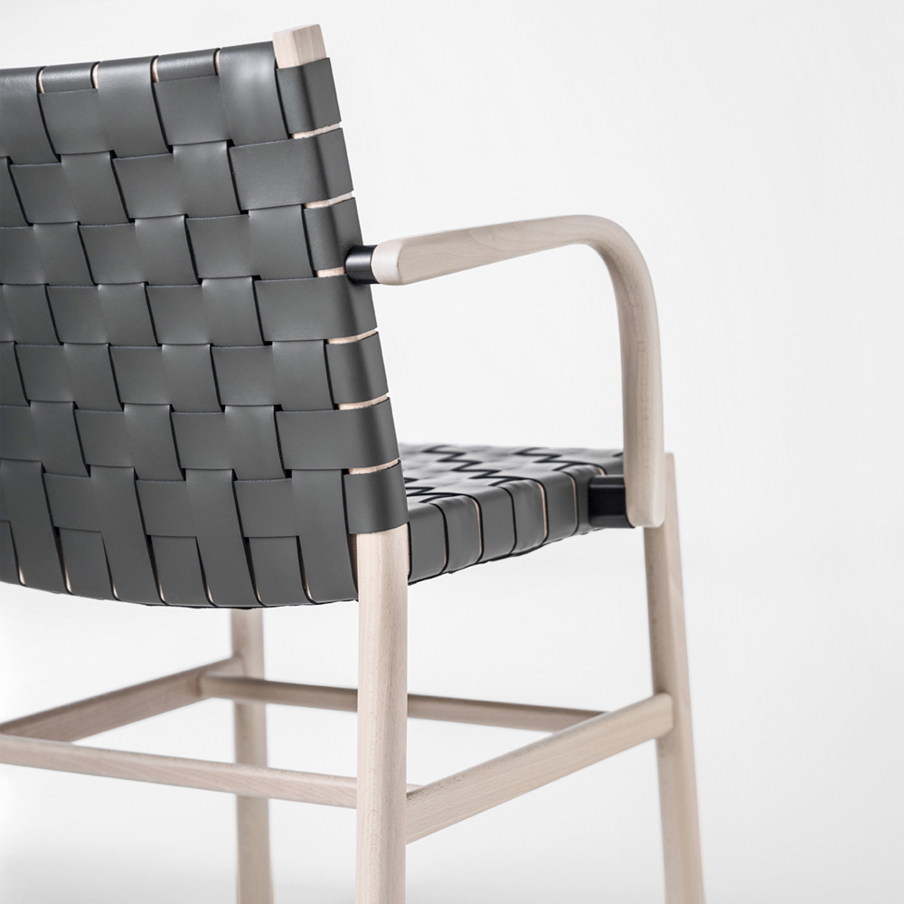 Moderner Stuhl mit Armlehnen aus Italien mit Struktur aus gebleichtem Buchenholz und Rückenlehne und Sitz aus gewebtem Leder . Tradition und Moderne treffen aufeinander und verschmelzen zu diesem innovativen Designobjekt mit einem eleganten Geschmack , der jede Umgebung auf originelle und kreative Weise charakterisieren kann. Das besondere Ledergewebe, das den Stuhl bedeckt, macht ihn äußerst faszinierend und ist ideal, um Ihre Räume mit Charakter zu bereichern und zu personalisieren. Dank der großen Auswahl an Farben können Sie zwischen einem nüchternen und diskreten Look oder einer farbenfrohen und extravaganten Lösung wählen, um alle Anforderungen zu erfüllen und gleichzeitig eine wunderbare Harmonie mit den umgebenden Möbeln zu schaffen.