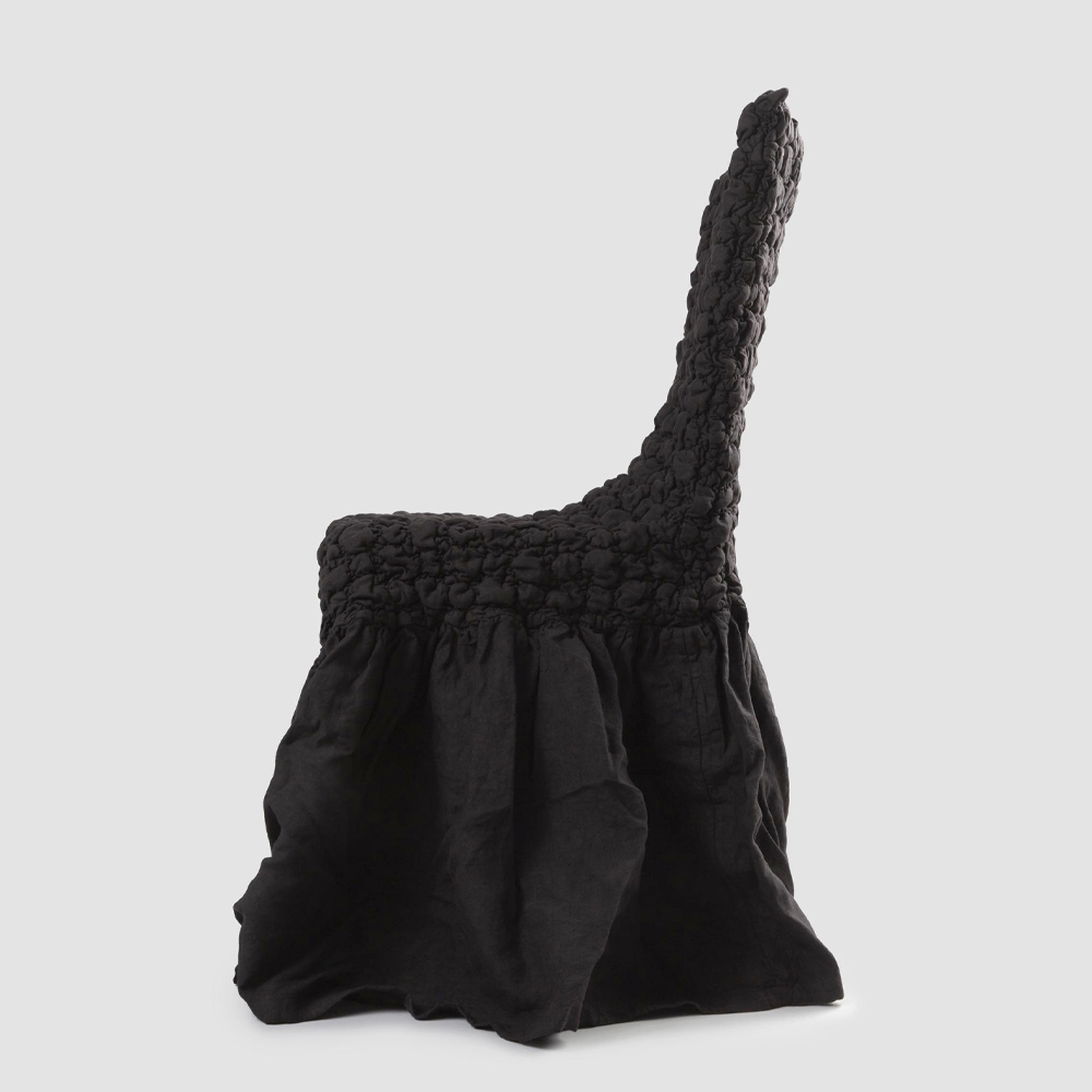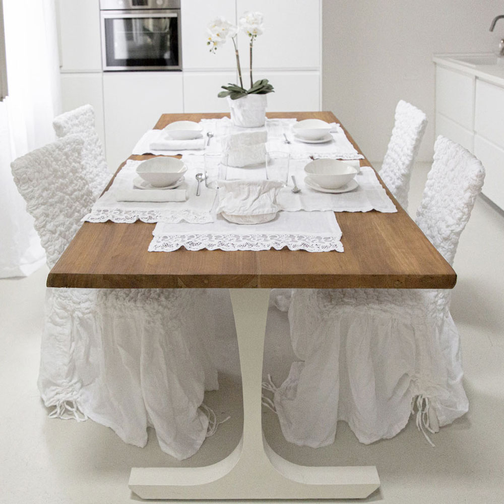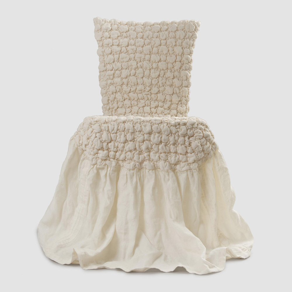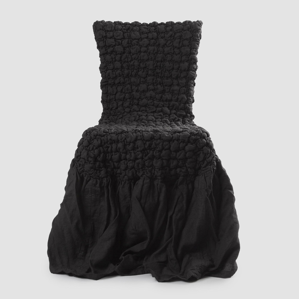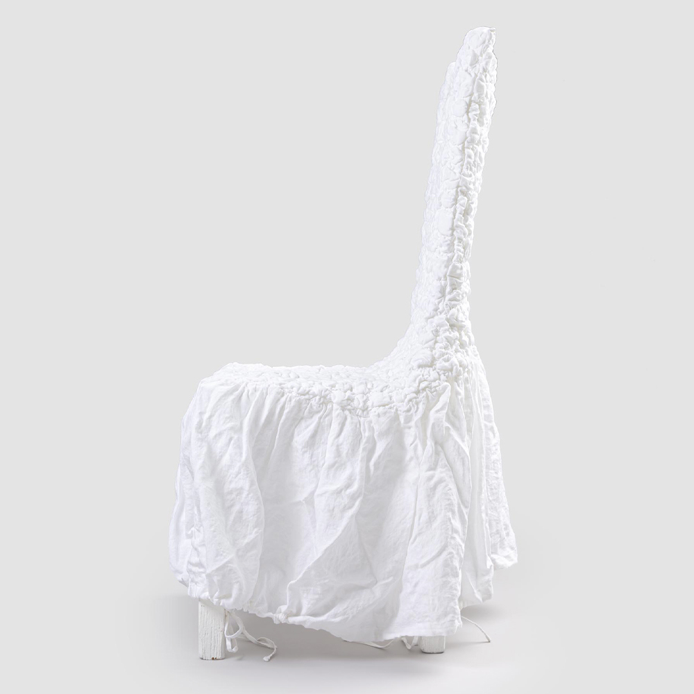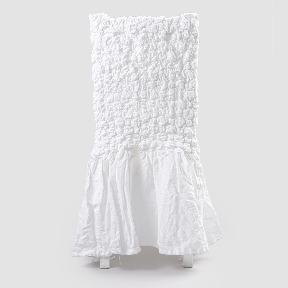 Stuhlbezug aus geprägtem hellem Leinen mit weißem, schwarzem, altem Butter- oder Mineral-Volant aus Italien.