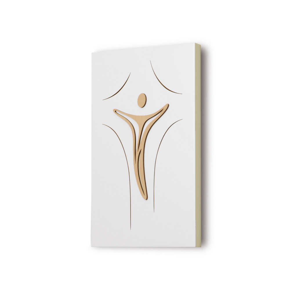 Bild/Kruzifix mit lackiertem Holzsockel und Applikation . Lasergravierte „Kommas“ . Loch zum Aufhängen an der Wand.