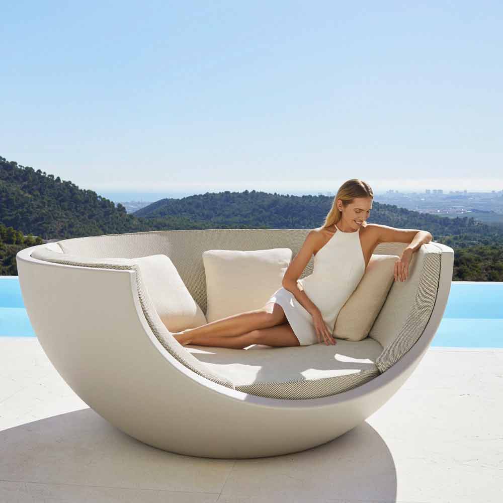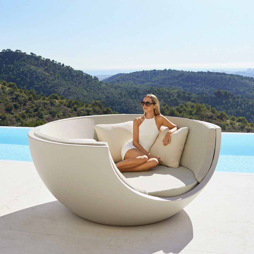 Luxus-Tagesliege im Freien mit kreisförmigem und rotierendem Design aus Polyethylen in verschiedenen Farben mit mattem Finish.