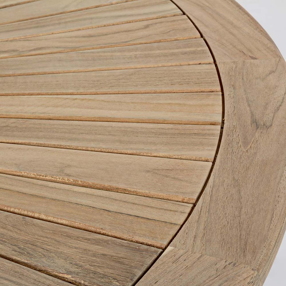 Hochwertiger Esstisch im Freien aus Teakholz mit zentraler Drehplatte.
