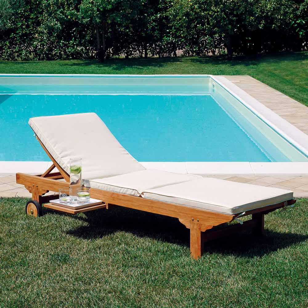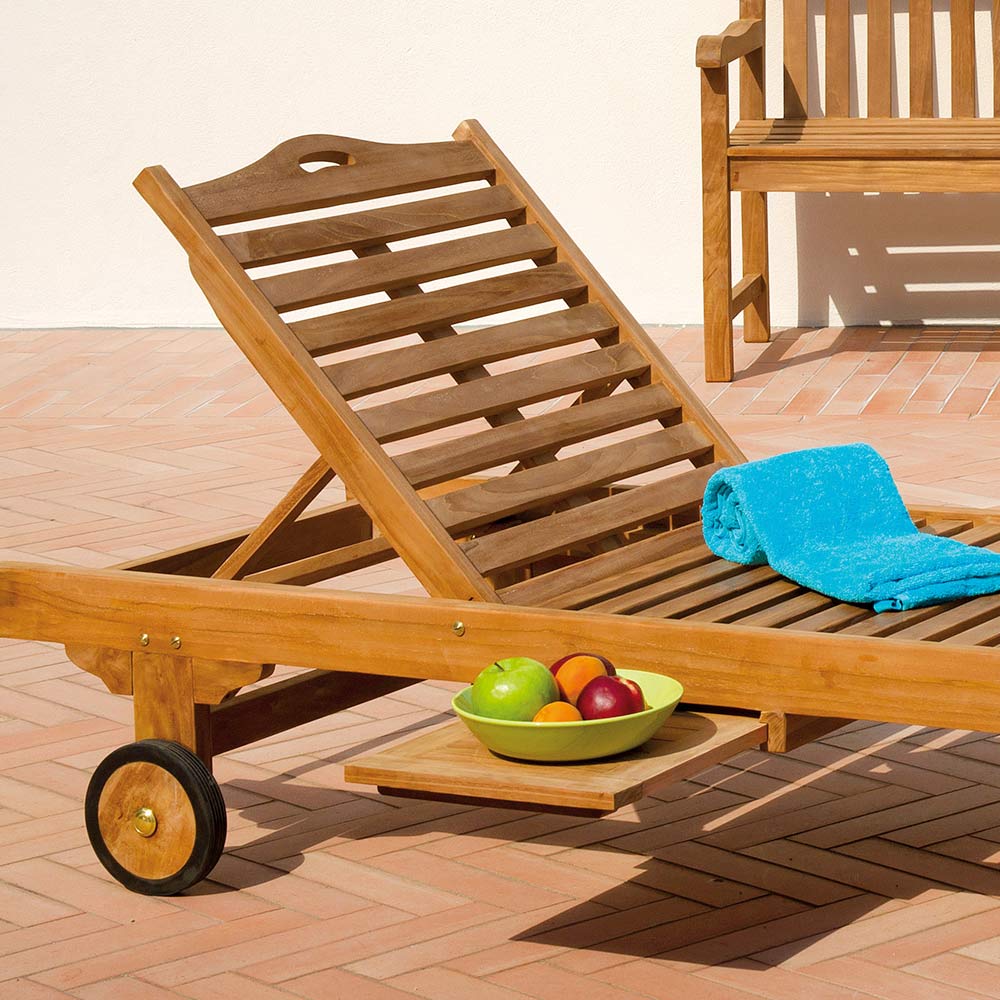 Sonnenliege für den Außenbereich komplett aus Teakholz mit Rädern und abnehmbarem Tisch .