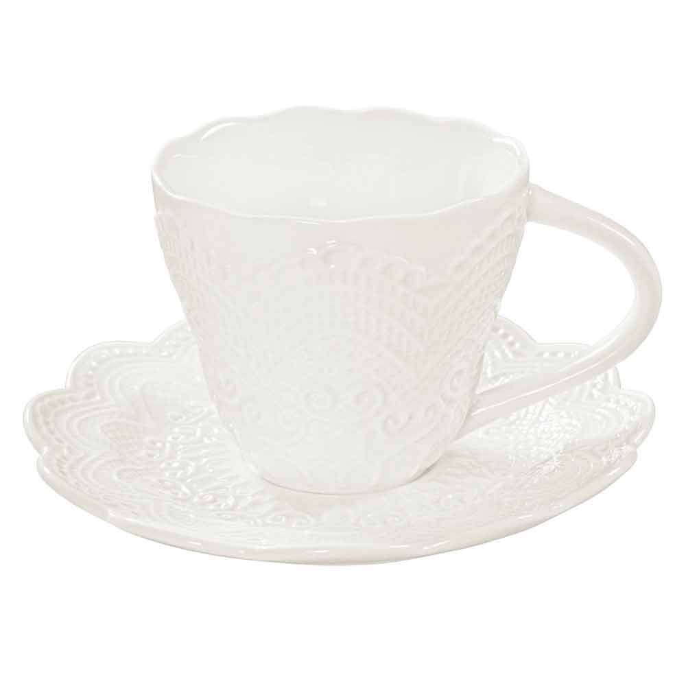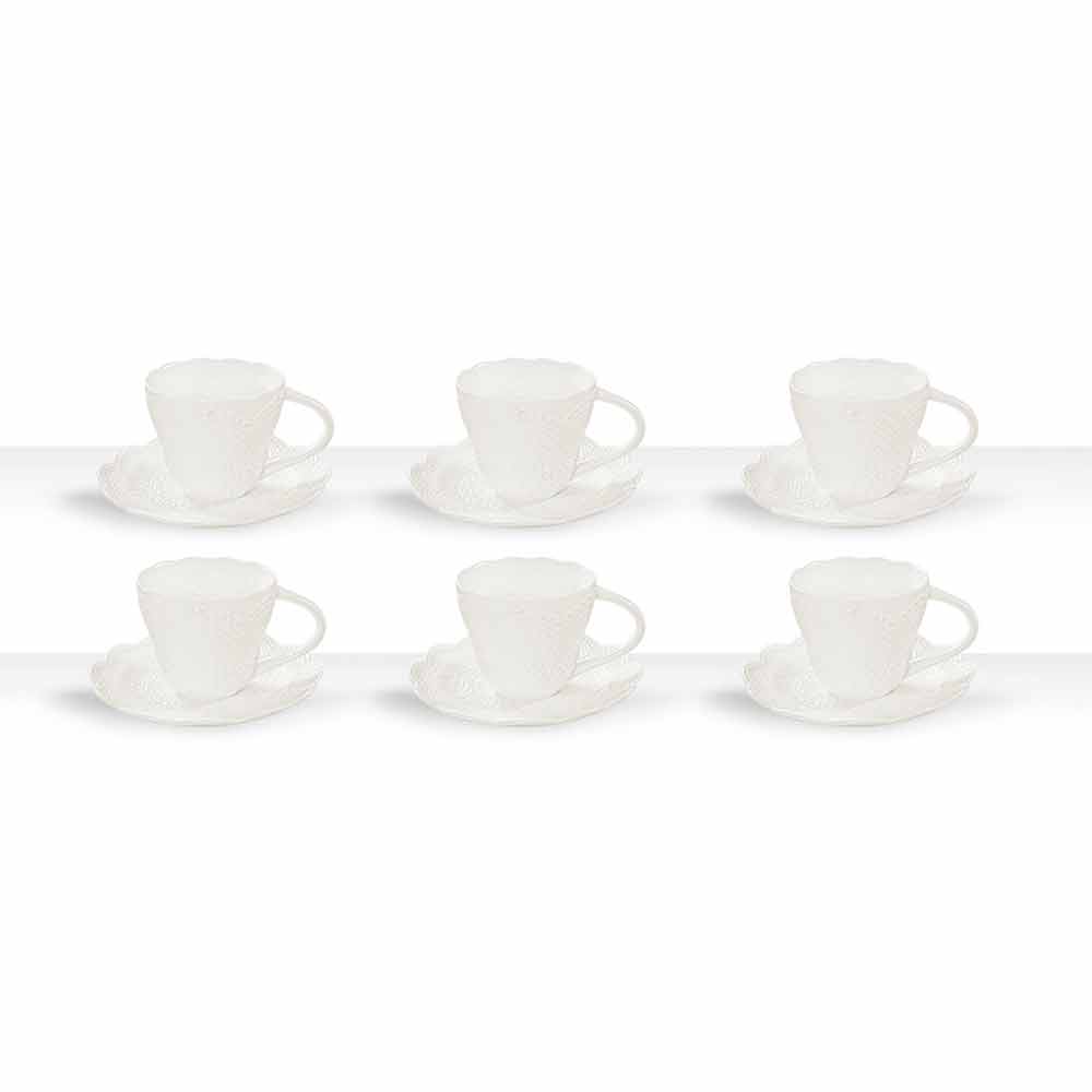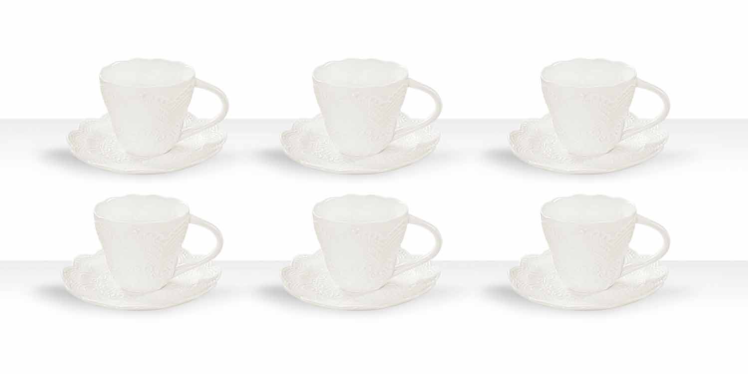 6 Teetassen mit Untertasse aus weißem Porzellan im raffinierten Barockstil.