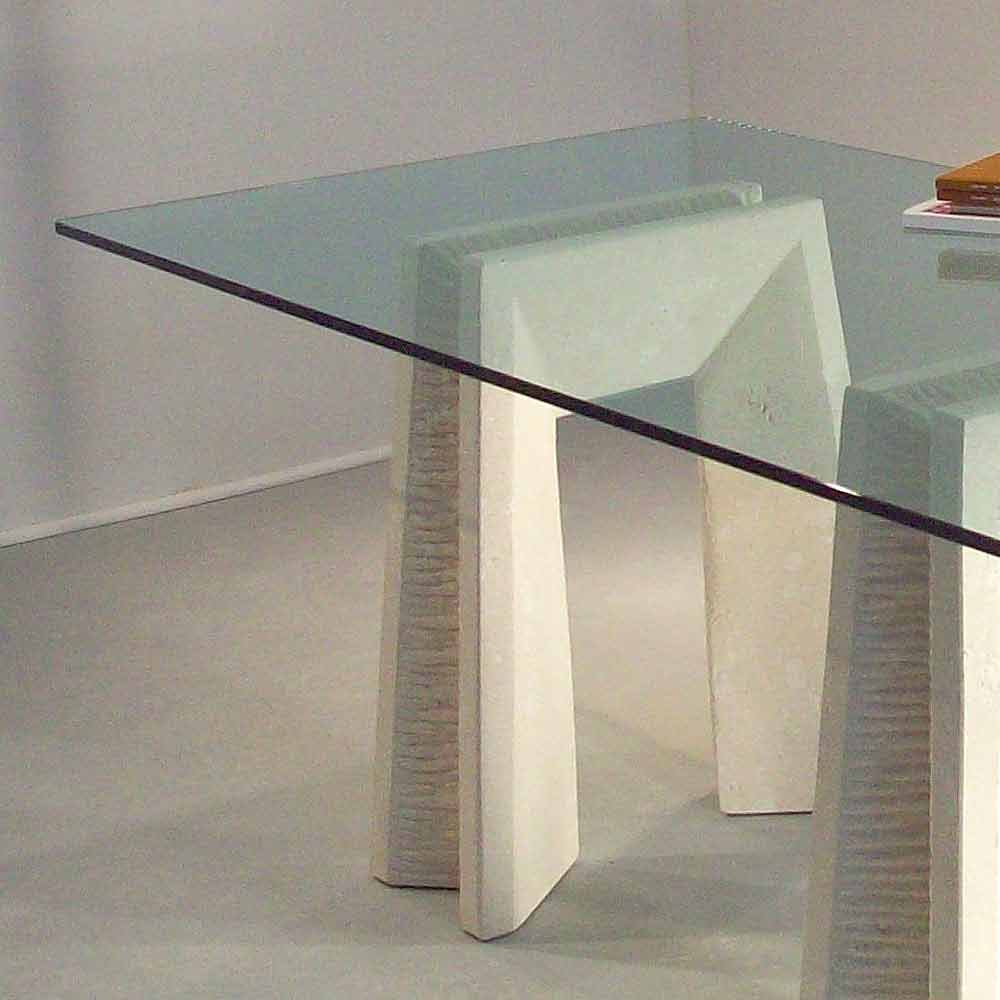 Die Basis ist aus Naturstein aus Vicenza hergestellt und wird von Hand bearbeitet. Die Tischplatte besteht aus Kristall float mit einer Dicke von 15 mm und ist an dem Stein mit einem Flansch befestigt.