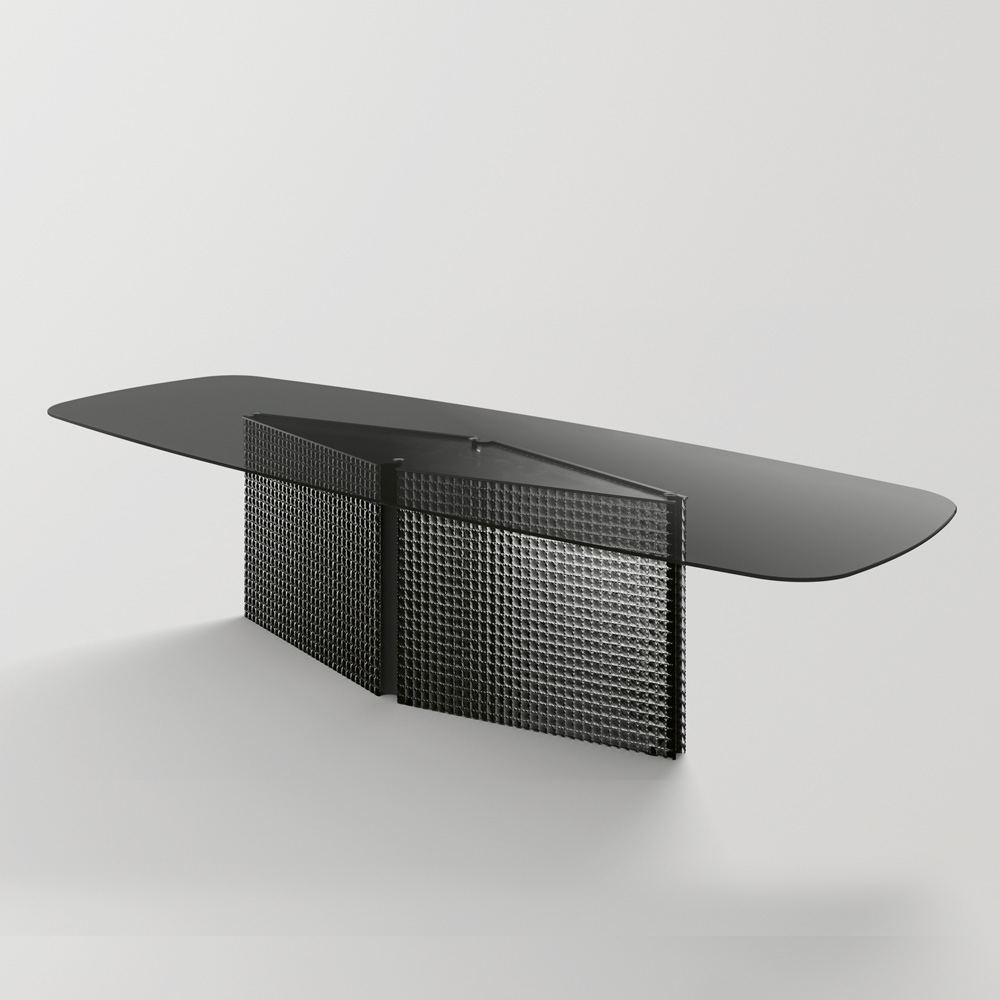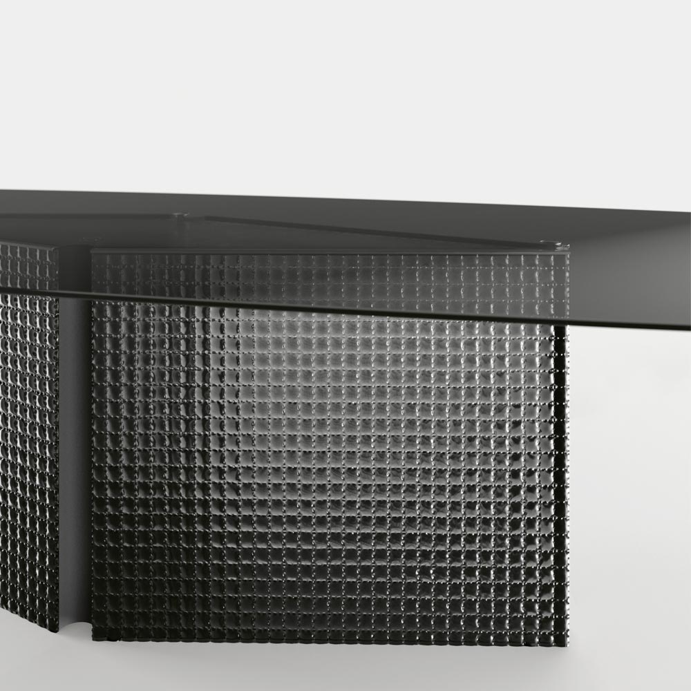 geformter Platte aus gehärtetem Glas, die durch Stahlplatten am Untergestell befestigt ist, und zentralem Untergestell aus