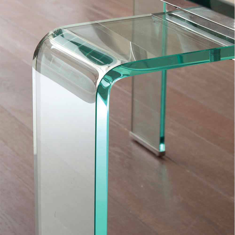 Die Tischplatte ist aus durchsichtigem Hartglas (Tischplatte Dicke 9 mm, Beine 14 mm), das Gestell ist aus verchromtem Metall.