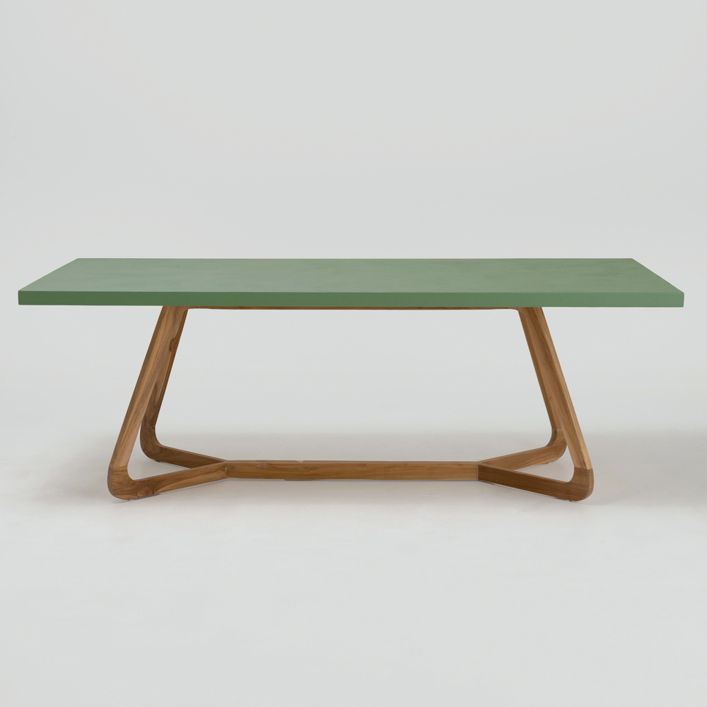 Esstisch mit Okumé-Marinesperrholzplatte (Dicke 25 mm) mit äußerer Mikrozementoberfläche (3 mm dick), 50 mm Umfangskantenhöhe und 35 mm dickem Sockel aus natürlichem massivem Teakholz , vollständig in Italien hergestellt. Das Finish ist sehr effektiv, da es die Textur hervorhebt, sich aber dennoch gut anfühlt.