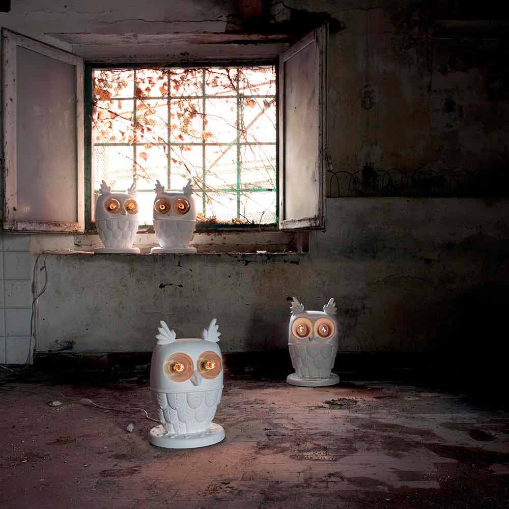 Diese originelle und einzigartige Tischlampe hat ein modernes und schönes Design in Form einer Eule, bei der die Augen der Lichtquellen einen leichten und raffinierten Geist verleihen.