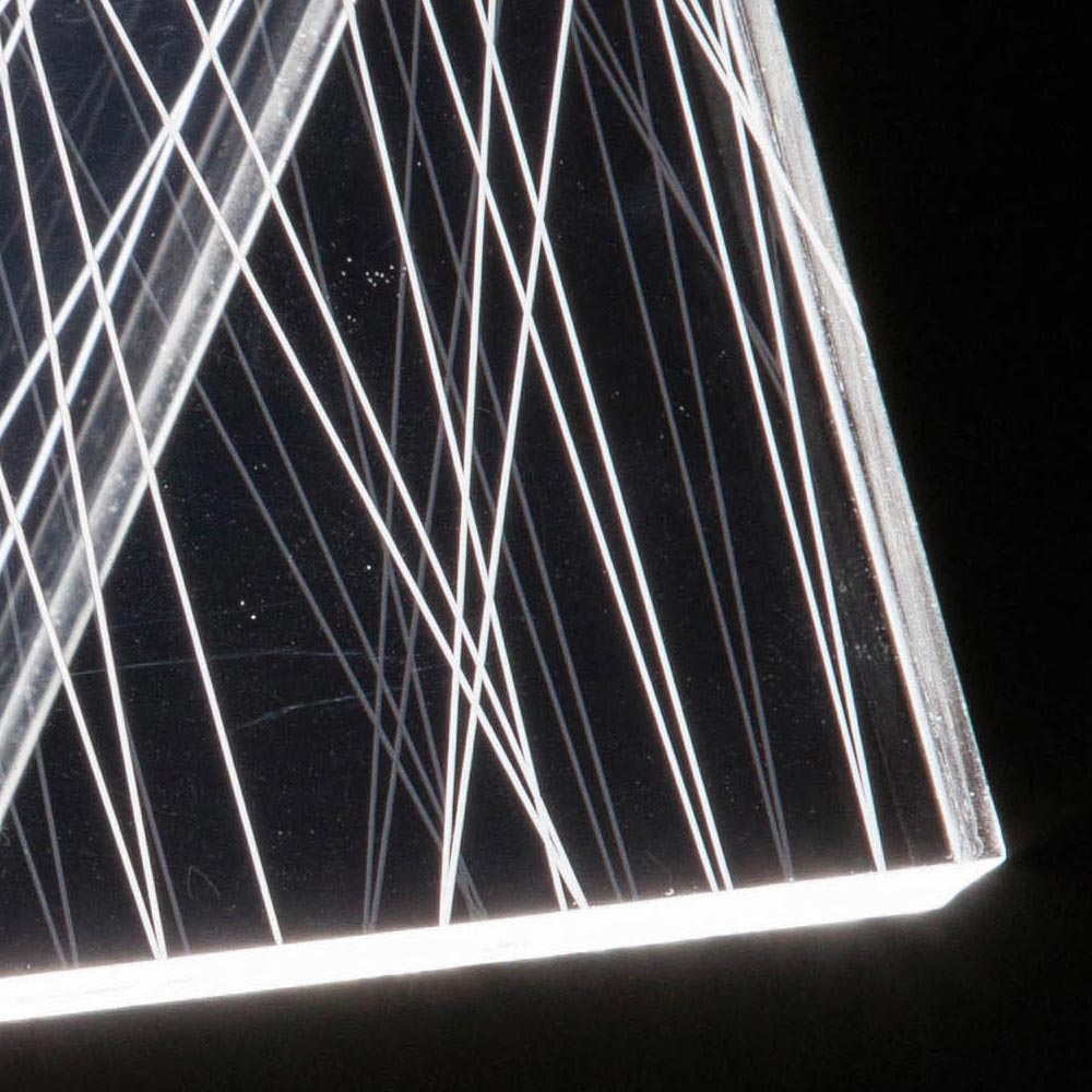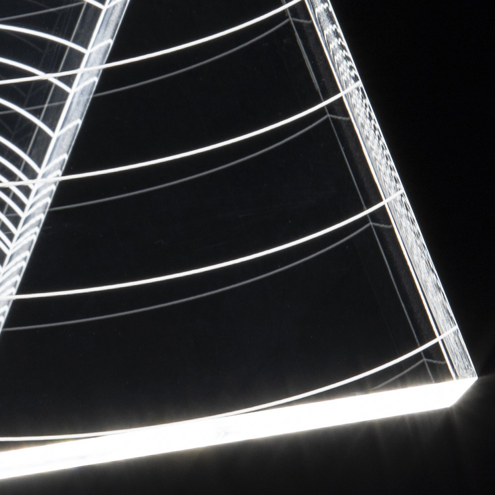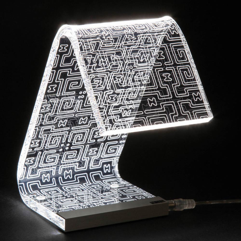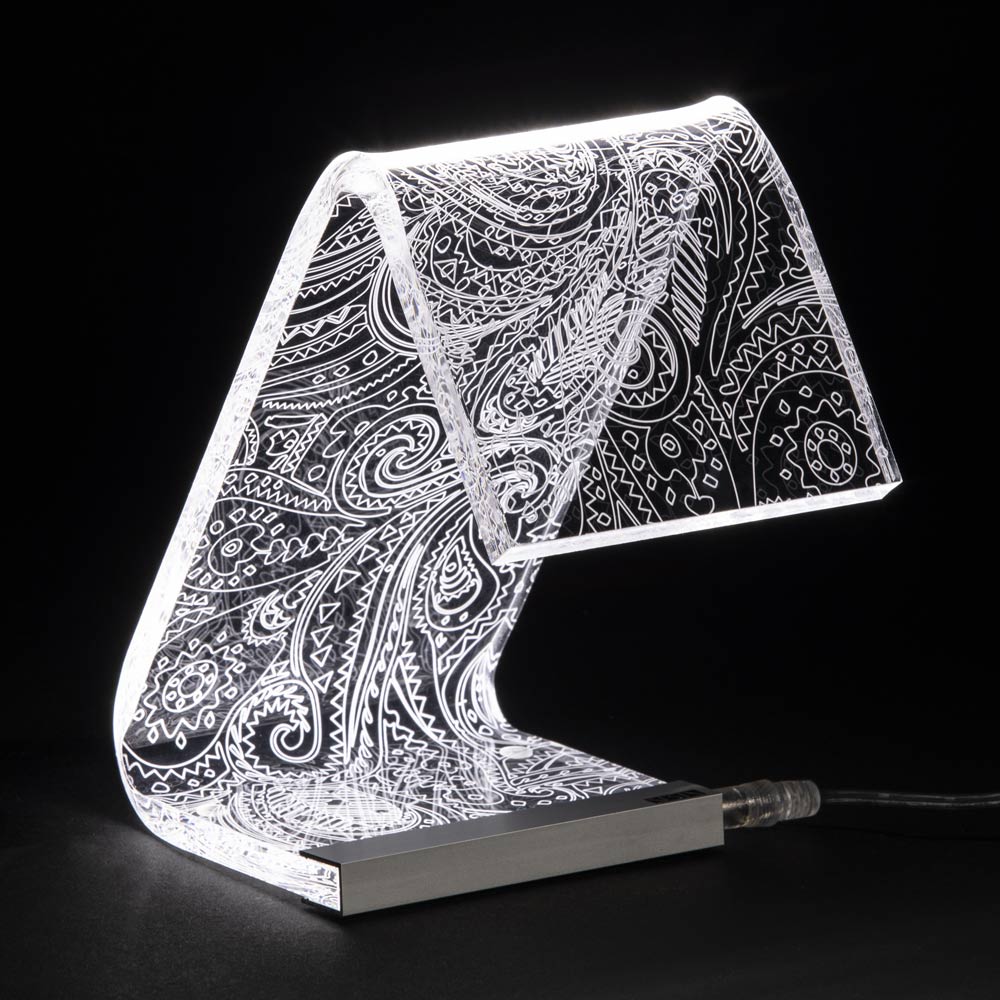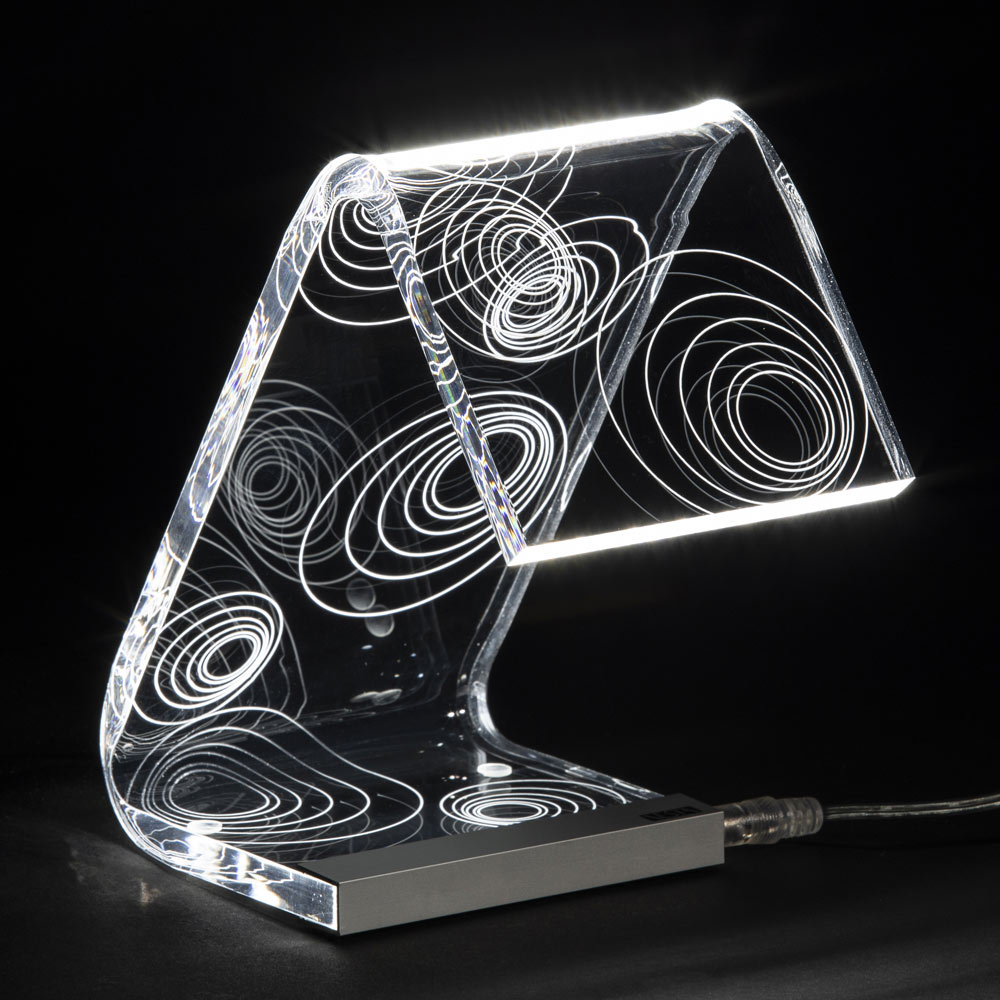 Diese Tischlampe es ist vollständig mit einer Dicke von 10 mm aus transparentem Acrylglas und gefaltet von Hand hergestellt und wird durch Laser Gravuren auf der Oberfläche , die durch eine LED - Leiste an der Basis, leuchtet entlang der gesamten Länge des Leuchtkörpers platziert gekennzeichnet, Schaffung ein außergewöhnliches Spieleffekt möglich dank der physikalisch-technischen Eigenschaften des Acrylglases.