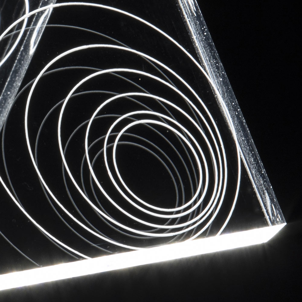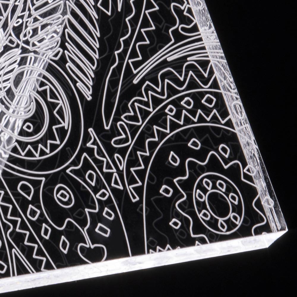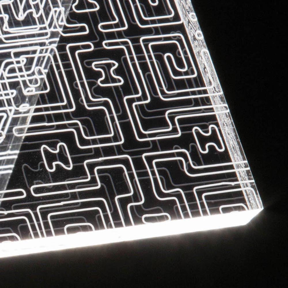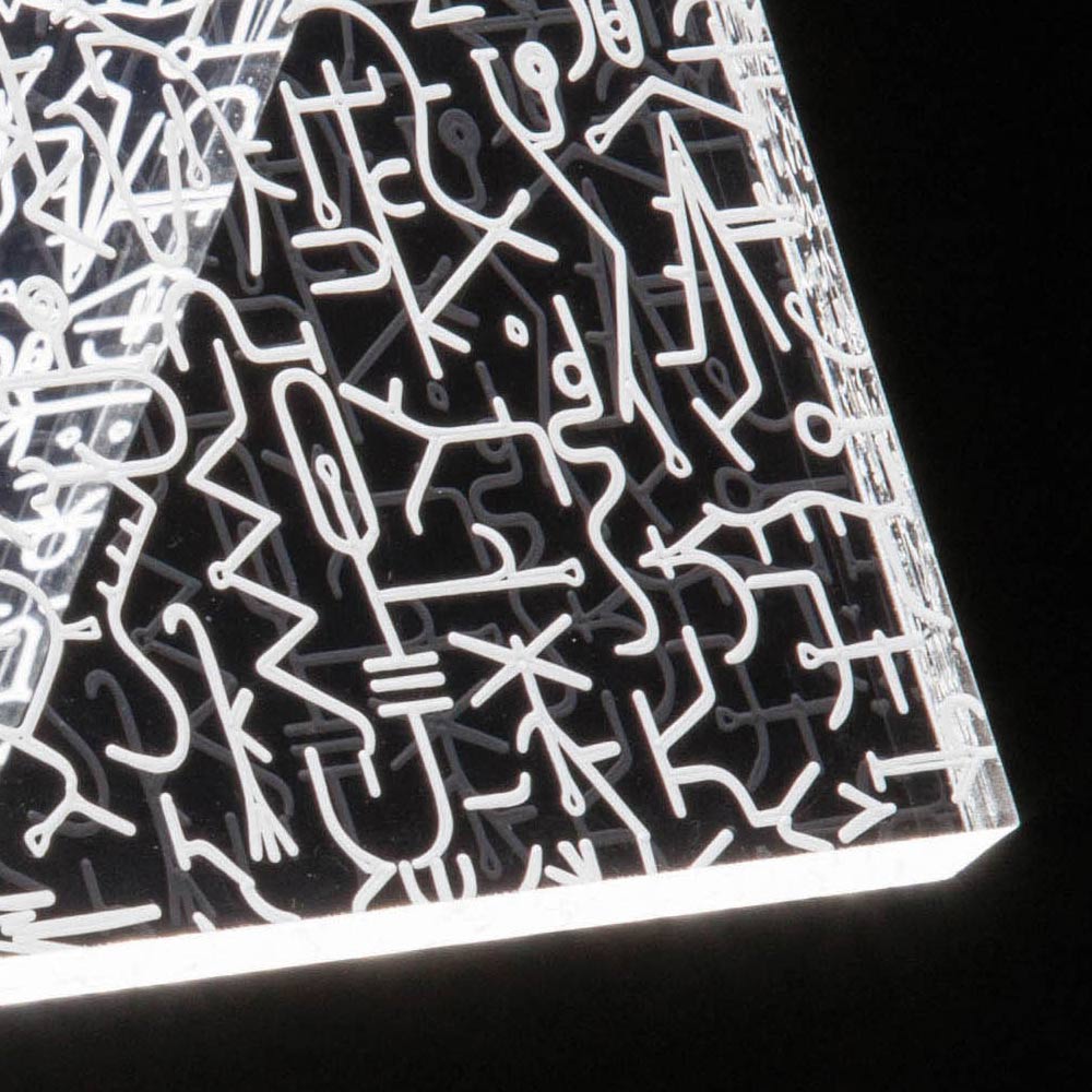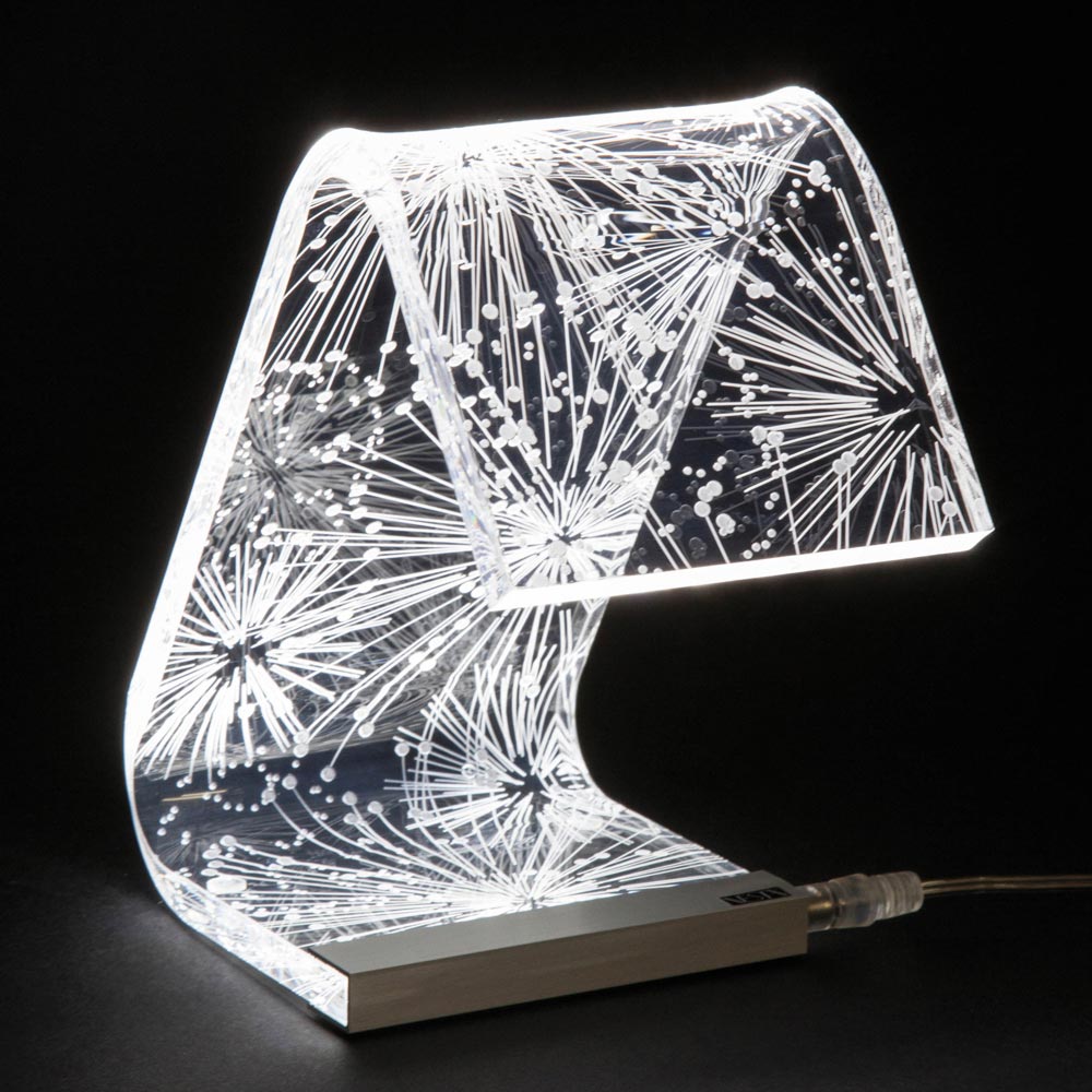 Diese Tischlampe es ist vollständig mit einer Dicke von 10 mm aus transparentem Acrylglas und gefaltet von Hand hergestellt und wird durch Laser Gravuren auf der Oberfläche , die durch eine LED - Leiste an der Basis, leuchtet entlang der gesamten Länge des Leuchtkörpers platziert gekennzeichnet, Schaffung ein außergewöhnliches Spieleffekt möglich dank der physikalisch-technischen Eigenschaften des Acrylglases.