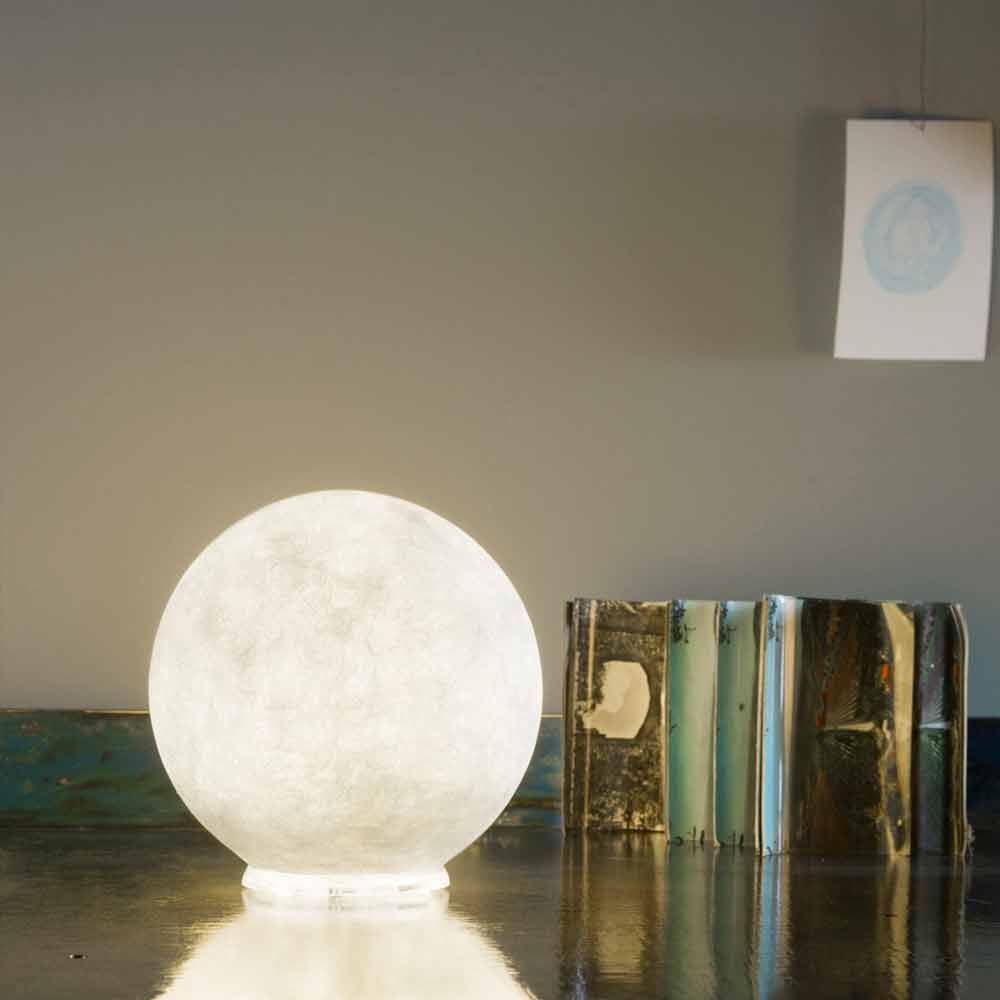 T.moon ist die ultramoderne Tischleuchte der Kollektion Luna by collection In-es.artdesign, das dank des innovativen Materials, mit dem es hergestellt wird, die magische Atmosphäre des Mondes reproduzieren kann: das Nebulite® , ein Material aus Harz und Fasern, dessen Adern der Lampe diesen besonderen "Mond" -Effekt verleihen.