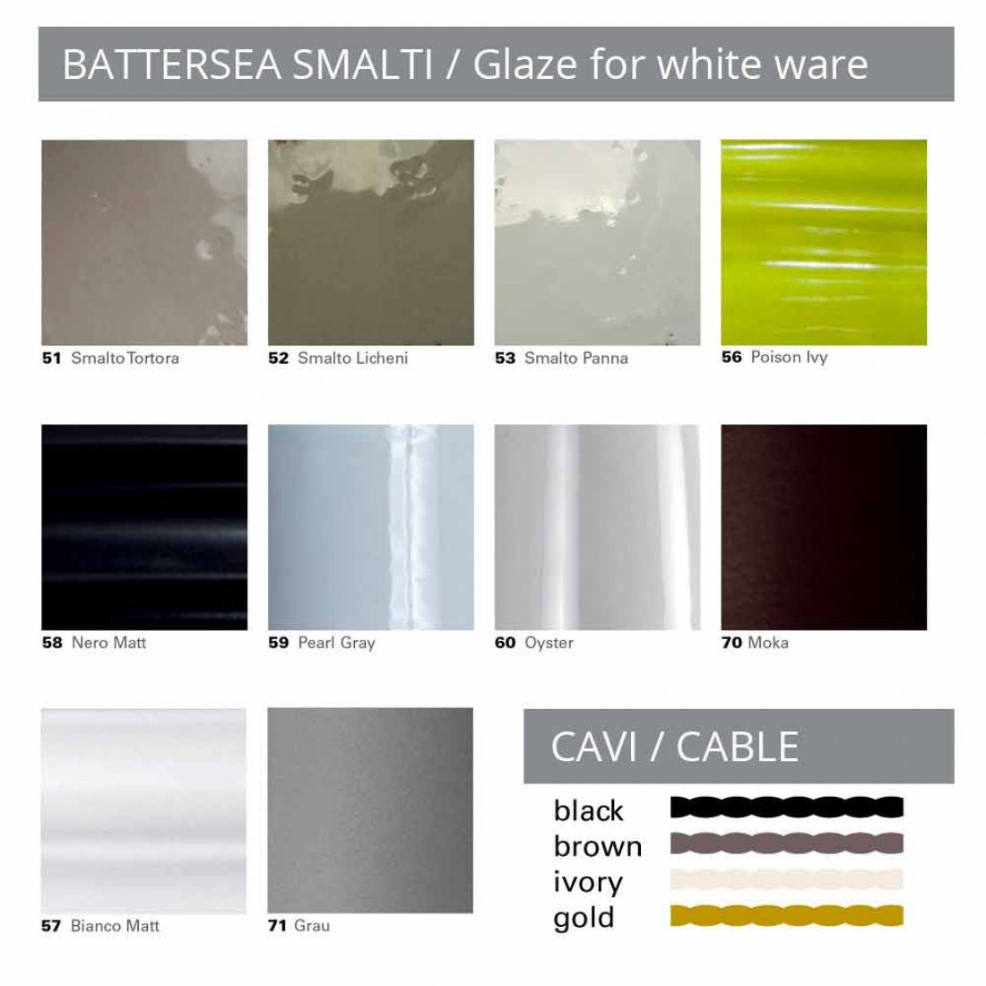 Battersea ist eine elegante und raffinierte Drahtaufhängung, beide mit Befestigungssockel und Diffusor, die nach echter toskanischer Tradition von Hand aus Keramik hergestellt werden. Das originelle Design dieser Aufhängung und ihre Linienführung sind aktuell und modern, passend für verschiedene Umgebungen. Lampe mit einem originellen Stil, der von Retro bis Modern reicht. Aus hochwertigen Materialien hergestellt, ist Battersea in verschiedenen Ausführungen erhältlich und garantiert einen direkten Lichtstrahl.