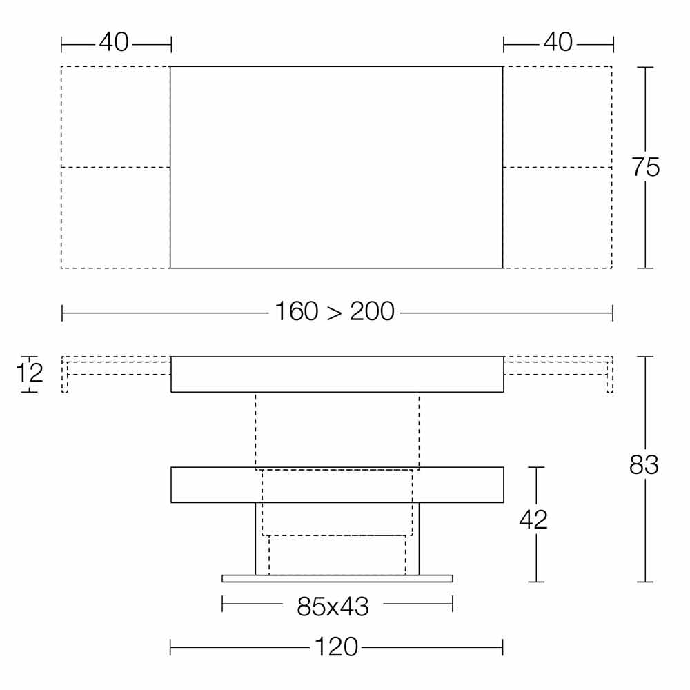 Maße Couchtisch: L 120 x T 75 x H 42 cm Tisch: L 160 (200) x T 75 x H 83 cm