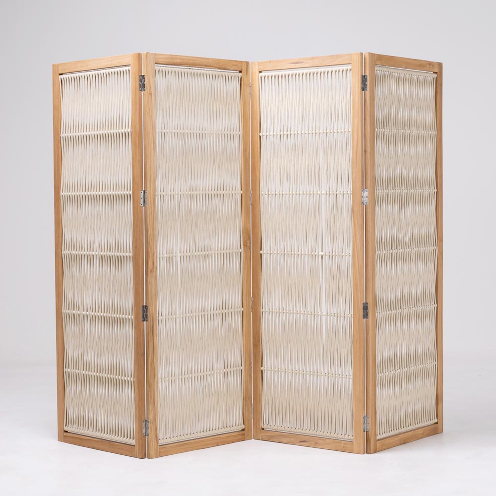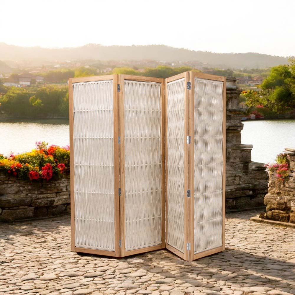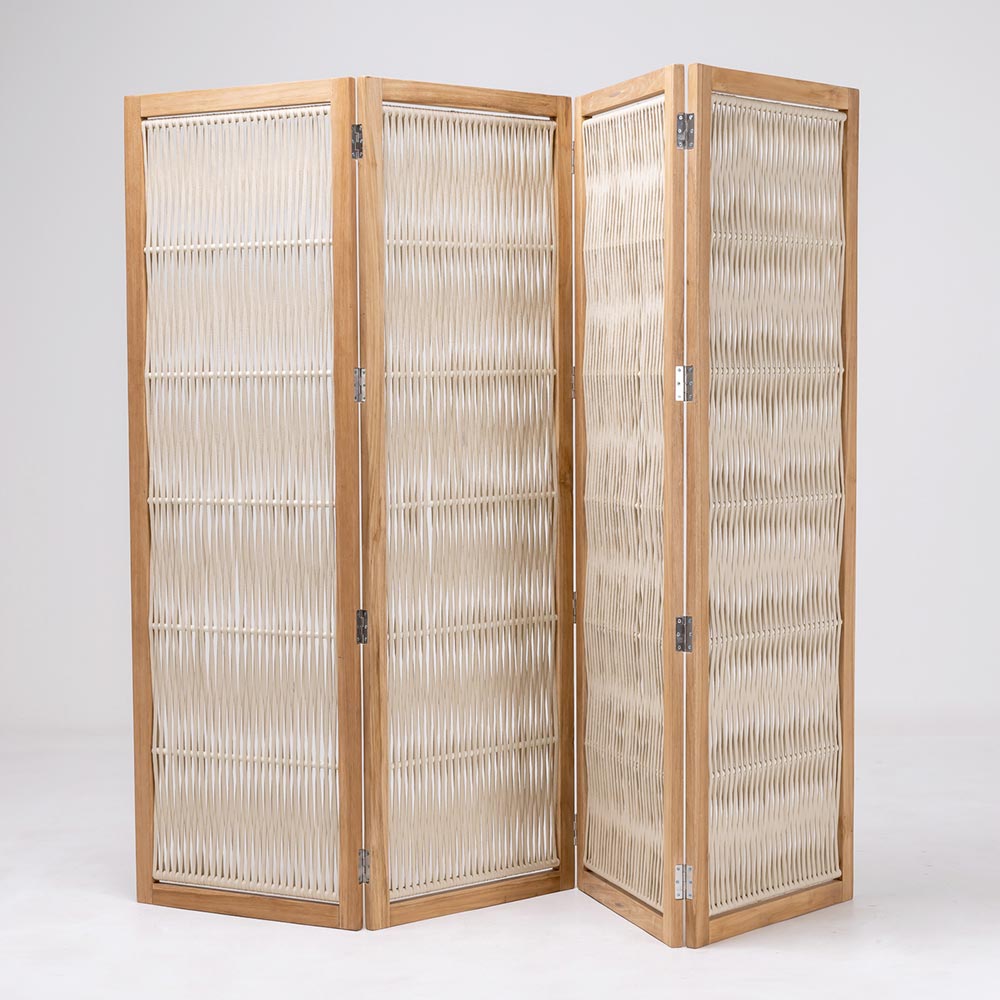 Dieser Gartentrenner stellt eine elegante Designlösung zur Definition von Außenbereichen dar und bietet eine Kombination aus Privatsphäre und Stil. Die Struktur aus Teakholz und Aluminium verschmilzt mit den Paneelen aus geflochtenem Seil und verbindet die Wärme des organischen Materials mit der Funktionalität eines mobilen Raumteilers.