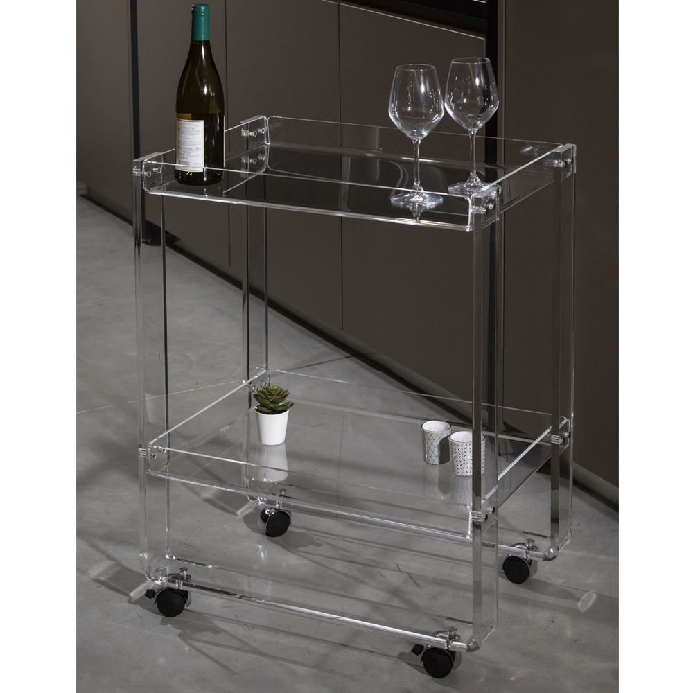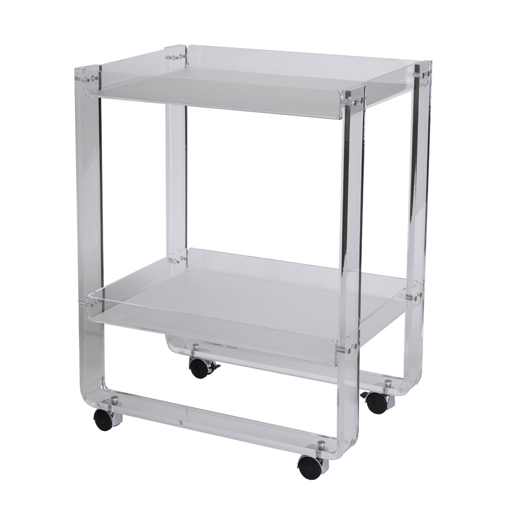 Transparenter Acryl-Kristallwagen mit Rollen und 2 Ablagen, hergestellt in Italien.