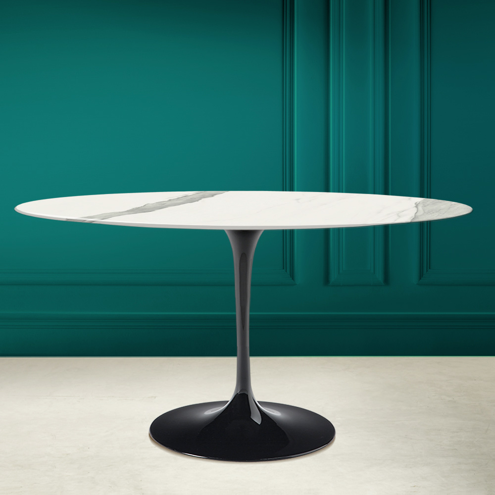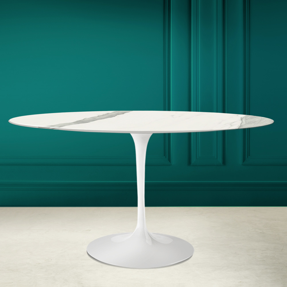 poliertem Aluminiumsockel. Dieser Tisch ist das perfekte Element, um jedem Wohnzimmer und jeder Küche dank der ovalen Form und der Statuario-Fulvein-Keramik eine originelle Note zu verleihen. Die
