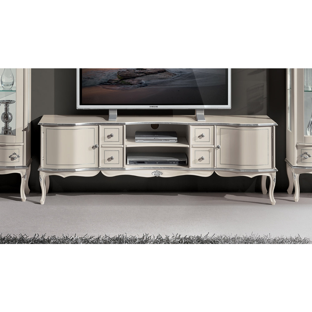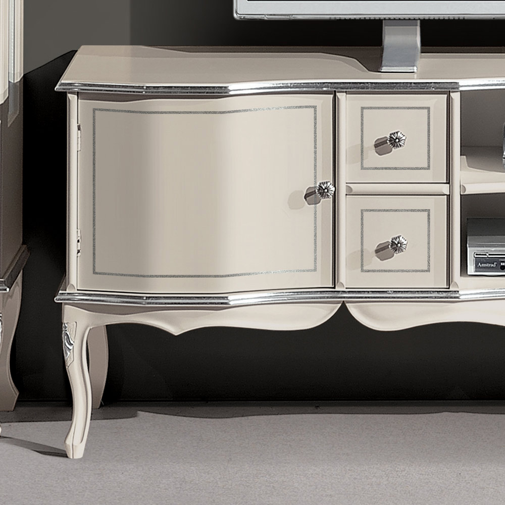 TV-Möbel im klassischen Stil mit 2 Türen, 4 Schubladen und 2 Fächern. Stil und Handwerkskunst kommen in diesem prächtigen Möbelstück aus edlem weißem Holz mit silbernen Details zum Ausdruck , einem raffinierten Accessoire, das die Umgebung, in der es aufgestellt wird, aufwertet. Vollständig in Italien von erfahrenen Handwerksmeistern handgefertigt, ist es mit Geschick und Sinn für Eleganz vollendet. Die Produktion erfolgt aus hochwertigen Materialien und die Verarbeitung erfolgt von Hand mit der größten Sorgfalt und Professionalität, die Made in Italy -Produkte auszeichnet.