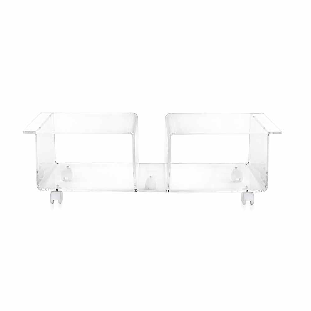 Das Mago Double mobile ist diskret und multifunktional und stellt einen TV-Ständer, einen Behälter für CDs, Bücher und Zeitschriften dar. Es eignet sich für die Neuanordnung von Tablets, Mobiltelefonen und PCs: vollständig transparent, mit einer Stärke von 10 mm aus PMMA in 100% reinem Polymer-Plexiglas. Laser geschnitten, hat Mago Double 4 Räder und kann überall dorthin bewegt werden, wo Sie es bevorzugen, es zu Hause zu platzieren. Die physikalisch-technischen Eigenschaften von Plexiglas (stoßfest, nicht verformbar, unveränderlich, wärmeisolierend) machen diesen Artikel zu einem praktischen und funktionellen Möbelstück, das für jede Umgebung geeignet ist. Die Helligkeit und Helligkeit werden über die Zeit konstant und unverändert beibehalten. Das PMMA Plexiglas aus reinem Polymer ist ungiftig, hypoallergen, geruchlos und antibakteriell. 100% recycelbar. Entworfen, entworfen und hergestellt in Italien, mit italienischen Materialien.