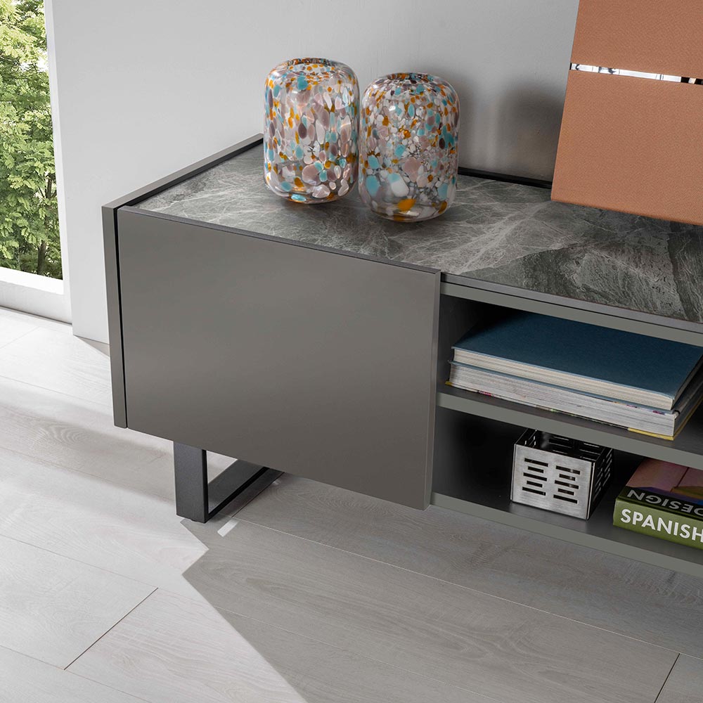 Klassisch und anmutig zeichnen sich diese furnierten MDF-Möbel durch ihren modernen Charakter und ihre klaren Linien aus. Die Keramikplatte mit Marmoreffekt ruht auf der raffinierten und diskreten Struktur. Durch den sanften Schließmechanismus ist dieser Artikel mit modernen Häusern kompatibel, die Wert auf Funktionalität legen, ohne auf einen Hauch von Klasse zu verzichten.