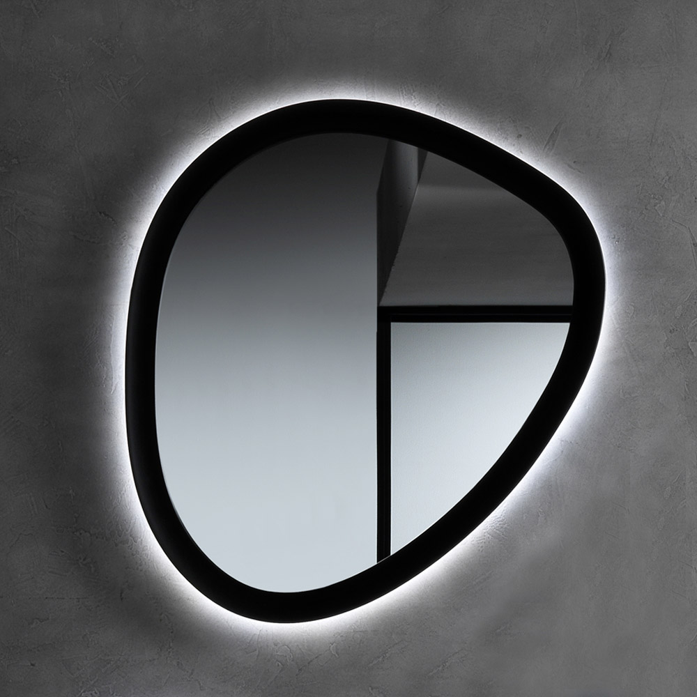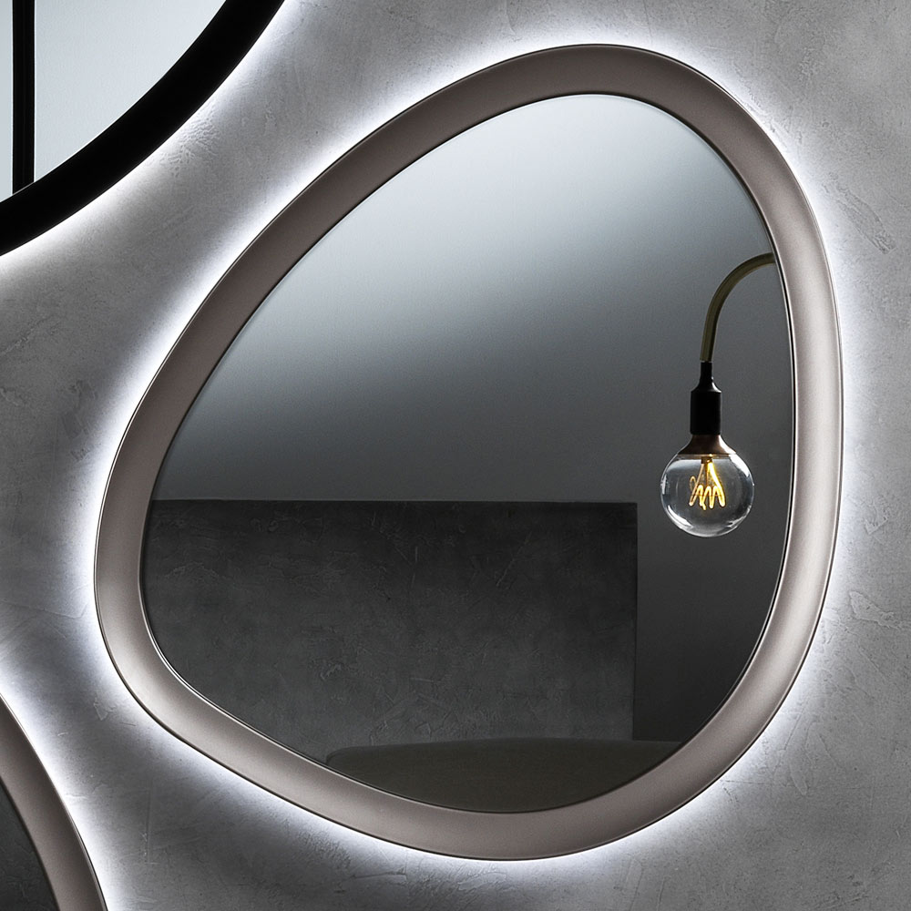 Tauchen Sie ein in den Charme dieses hinterleuchteten Spiegels , einem echten Einrichtungselement, das jede Wand in eine Galerie moderner Kunst verwandelt. Mit seiner Form distanziert es sich von der Konventionalität und wird zu einem Blickfang, der den Blick fesselt und die Fantasie anregt.