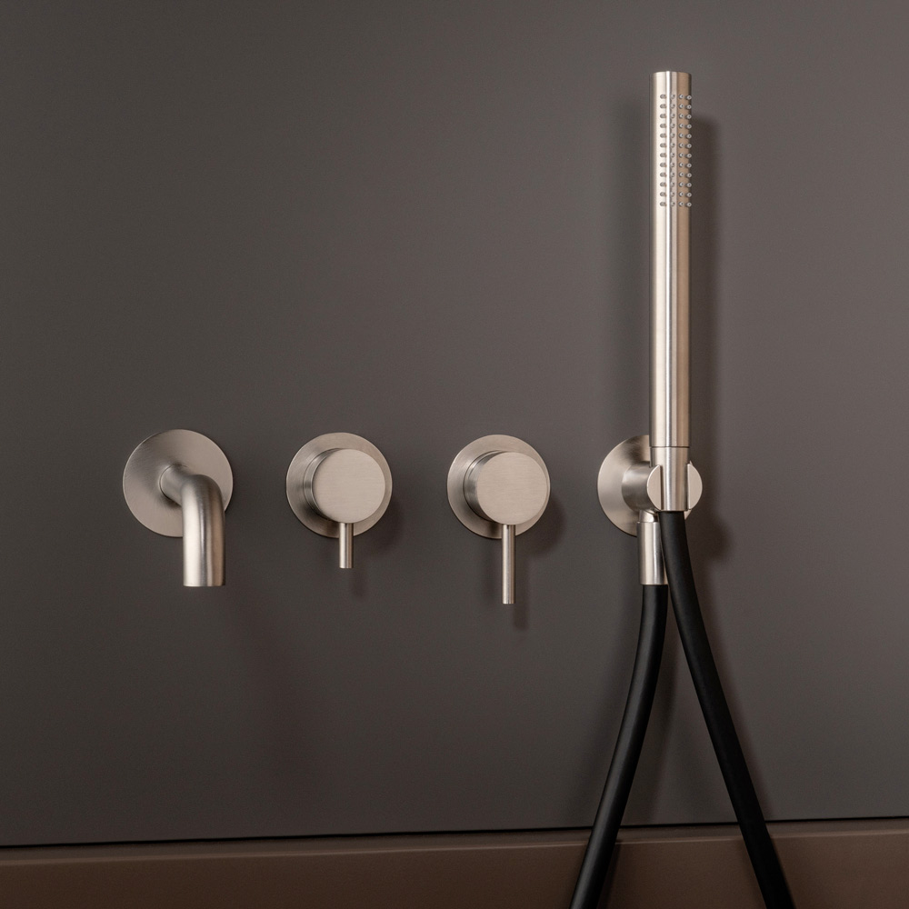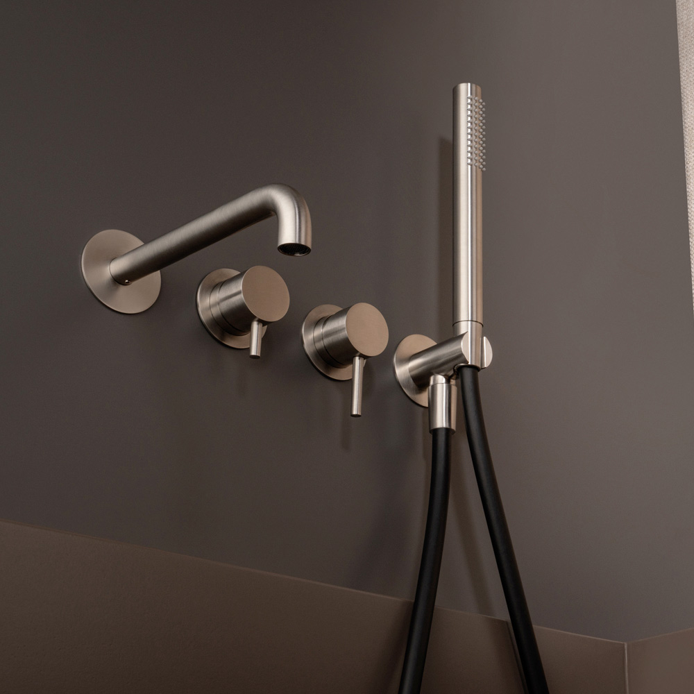 Unterputz-Wannenmischer mit Umstellhebel und Auslauf, mit Duschgarnitur aus Edelstahl AISI 316L , 100 % recycelbares Material, vollständig in Italien hergestellt.