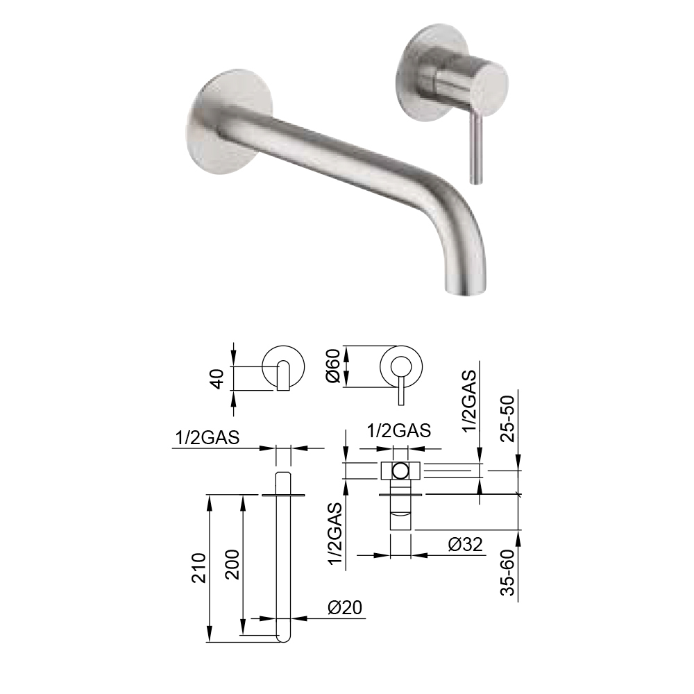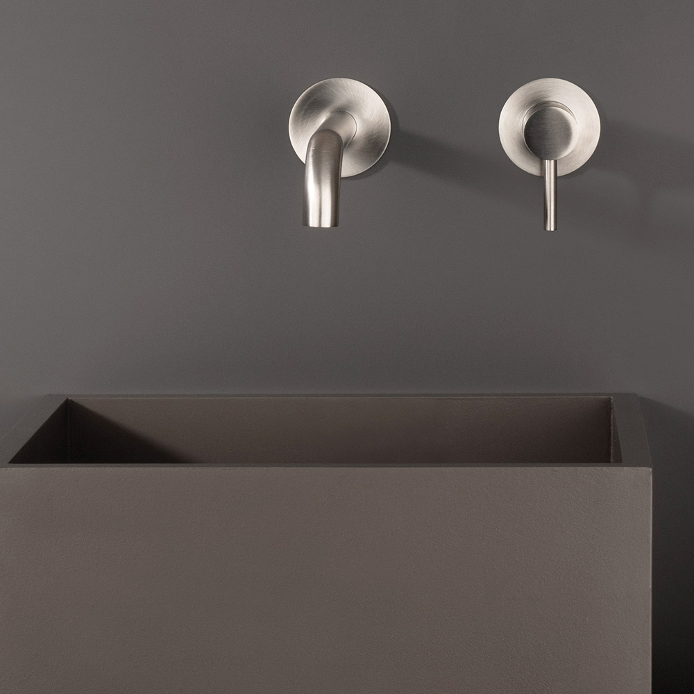 Eingebauter Waschtischmischer mit Wandauslauf, ohne Ablaufgarnitur, aus Edelstahl AISI 316L , 100 % recycelbares Material, vollständig in Italien hergestellt.