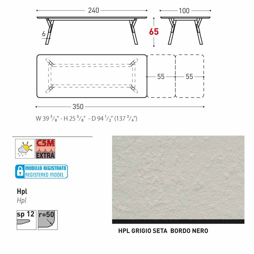 HPL Charaktereigenschaften: HPL heißt High Pressure Laminate. Diese Laminate bestehen aus mehreren Schichten Papier 70% mit einer 30% igen Harz Beschichtung, die unter hohem Druck zusammengefügt wurden. HPL-Platte (auf Basis thermohärtender Harze, homogen verstärkt mit Holzfasern, unter hohem Druck und Temperatur verpresst, der Pressvorgang dauert ca. 40 - 45 min). Das Ergebnis ist eine kompakte feste Tischplatte resistenter als je zuvor, die sowohl im Innenbereich, im Außenberich als auch im Marinebereich anewendet werden kann.