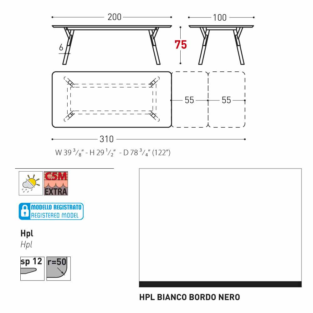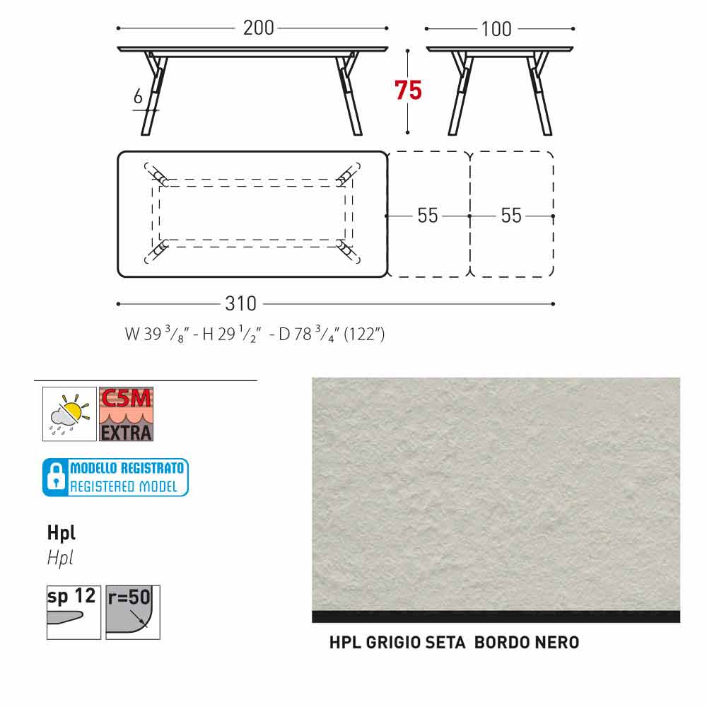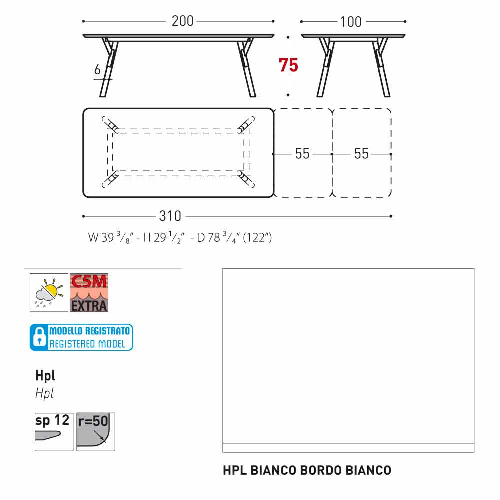 • 100x200/310xH75 cm - 2 Platten ausziehbar bis jeweils 55 cm