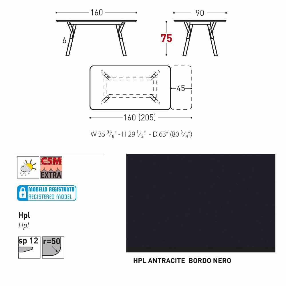 • 90x160/205x H 75 cm - 1 Platte ausziehbar bis 45 cm