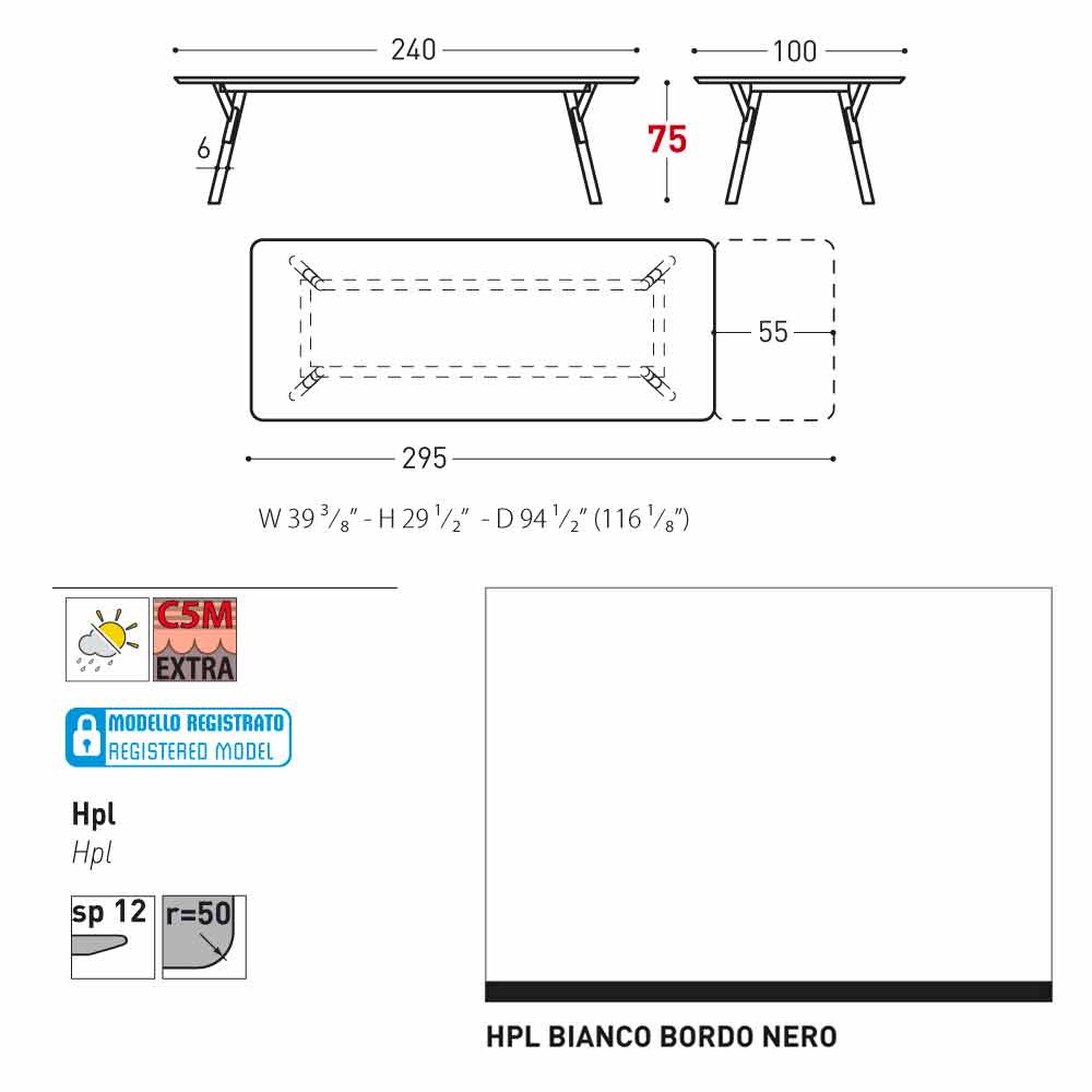 • 100x240/295xH75 cm - 1 Platte ausziehbar bis 55 cm