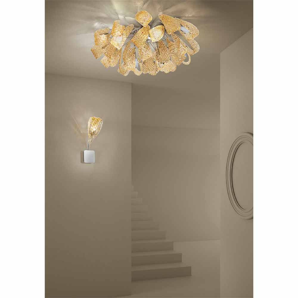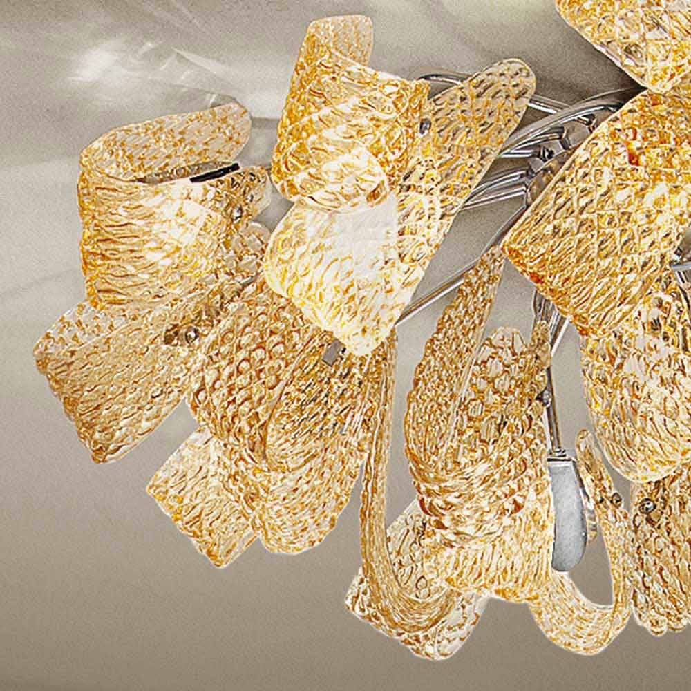 Elegante und majestätische Deckenleuchte made in Italy aus handgefertigtem venezianischem Glas mit Bernstein-Finish und Details aus poliertem Chrommetall . Eine Beleuchtungsidee, die aus üppigen Bändern und ungewöhnlichen Texturen besteht , die ihrer ästhetischen Originalität und Dynamik verleihen. Auffallend ist die geometrische Textur , die die Glasoberfläche bedeckt, auf der sich das Licht in den Metalldetails für wunderbare Reflexionsspiele spiegelt . Das Ergebnis ist eine wundervolle Deckenleuchte, die sich jeder zeitgenössischen Umgebung anpasst und klassischeren Räumen Charakter verleiht und sich als besonders vielseitig erweist.