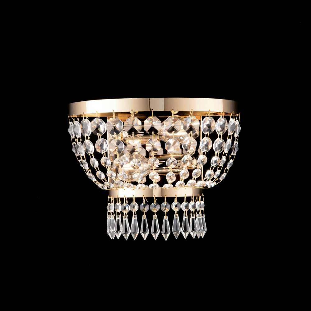 Diese edle und kostbare Wandleuchte aus Eisen und Messing mit Strasssteinen ist ein Beleuchtungselement, das Wände dezent und elegant in Szene setzt. Die kompakte, mit leuchtenden Strasssteinen und dekorativen Anhängern verzierte Leuchte erzeugt ein helles, umhüllendes Licht und ein faszinierendes Lichtspiel.