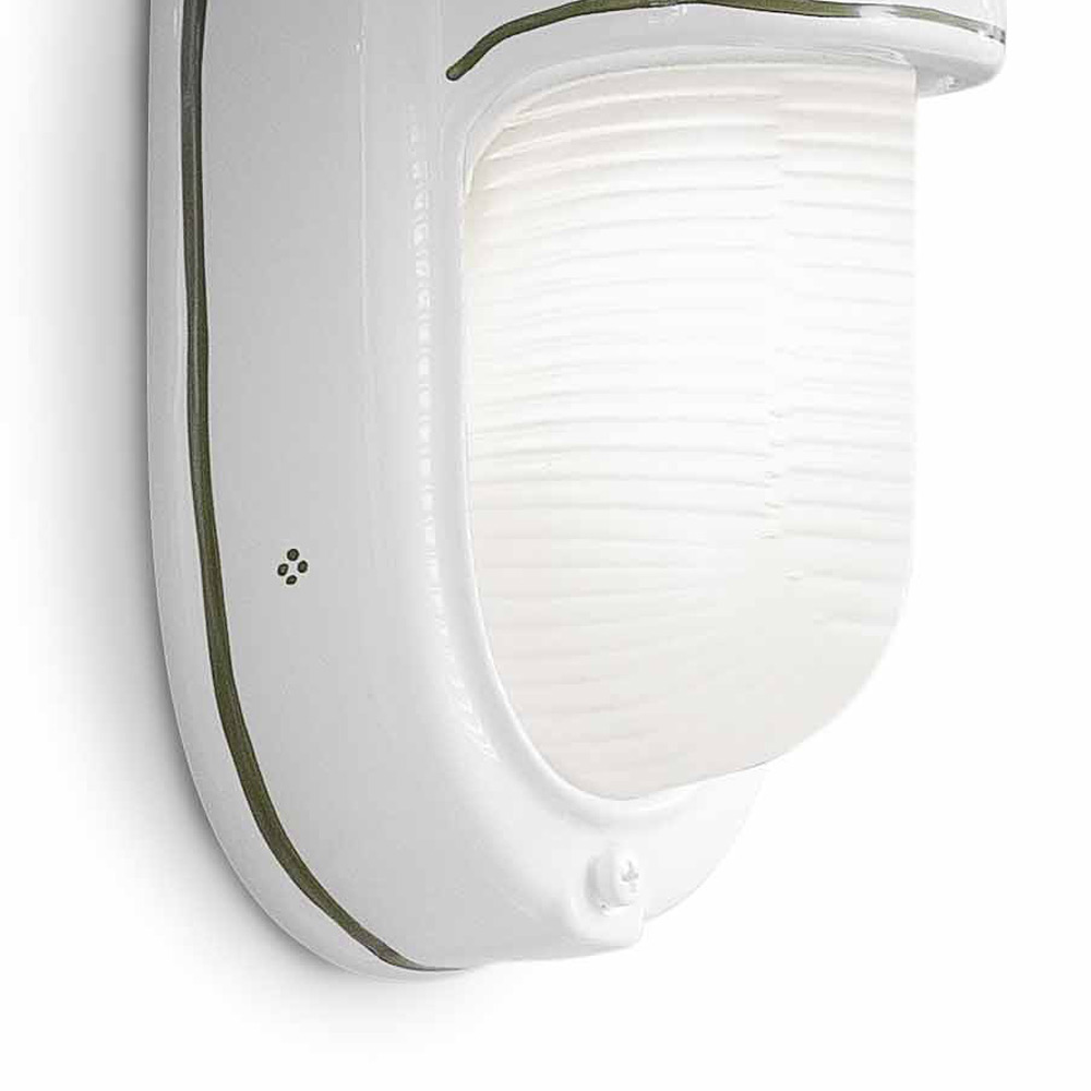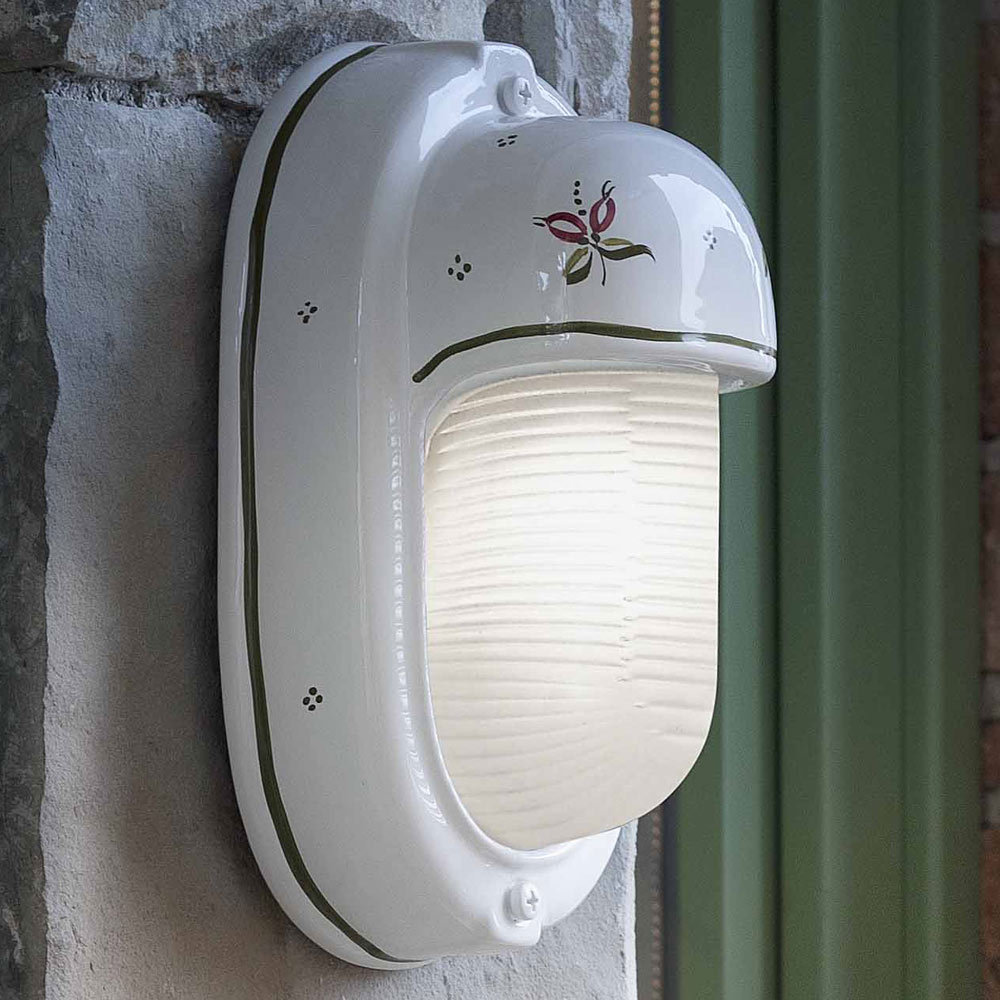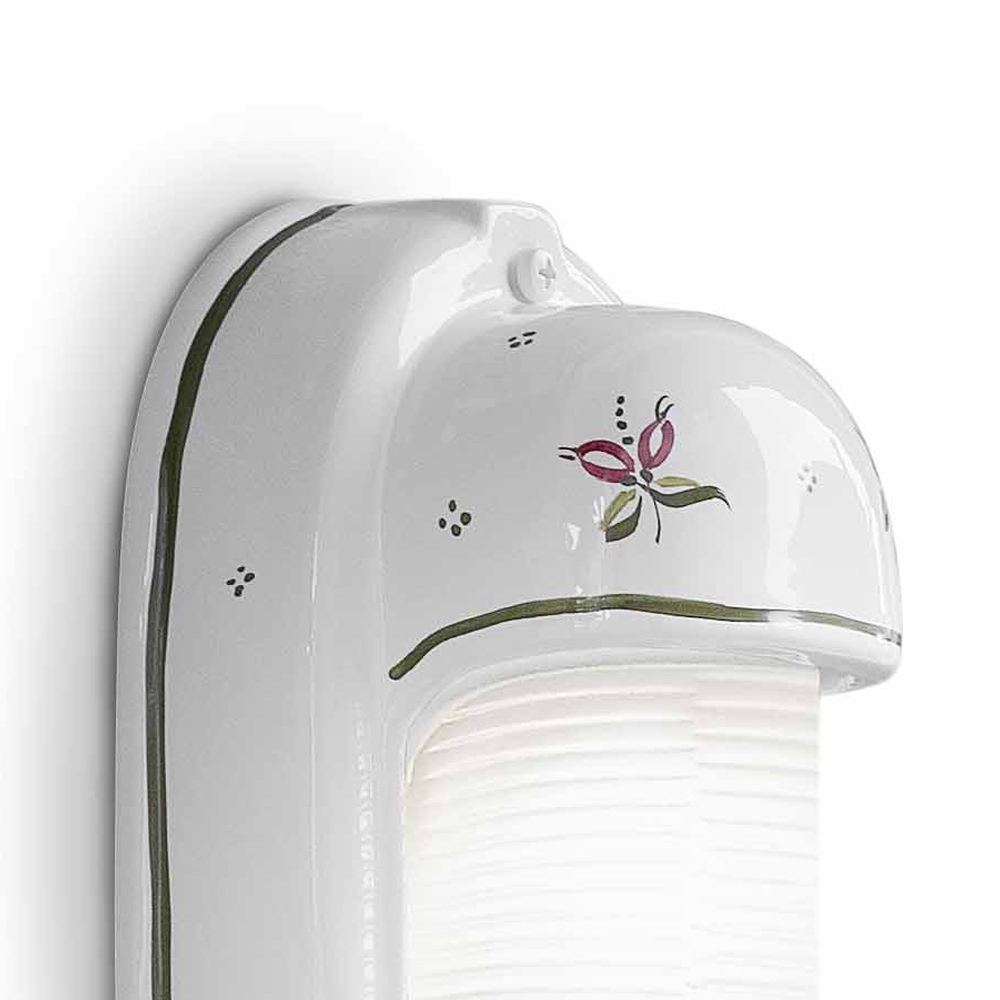 Diese vertikale Gartenwandleuchte besteht vollständig aus Keramik , die mit handgemalten Blumen für einen klassischen und harmonischen Stil zwischen Form und Farbe verziert ist.