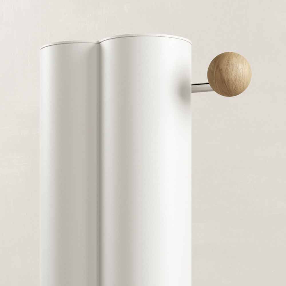 Die Ergänzung ist zusätzlich zu den im Dropdown-Menü erhältlichen Ausführungen in verschiedenen Ausführungen erhältlich und umfasst einen Handtuchhalter 90 cm über dem Boden sowie einen natürlichen Buchenknopf, der im Preis inbegriffen ist und standardmäßig bereits am Kühler montiert geliefert wird. Die Stange und der Knopf können rechts oder links montiert werden: Wählen Sie die gewünschte Ausrichtung.