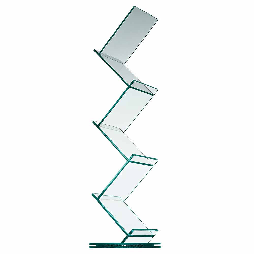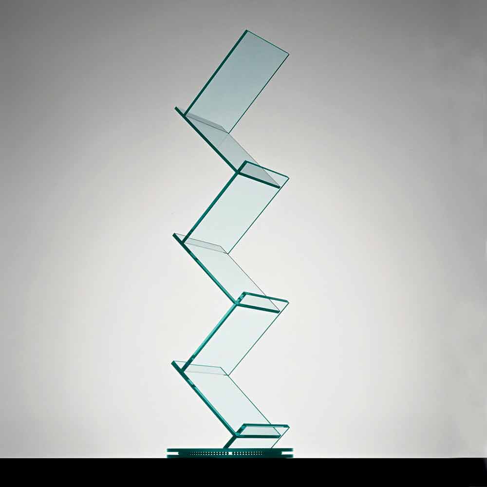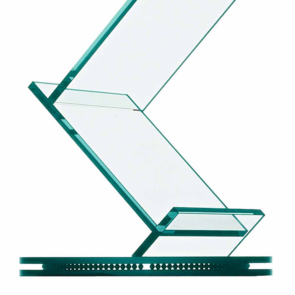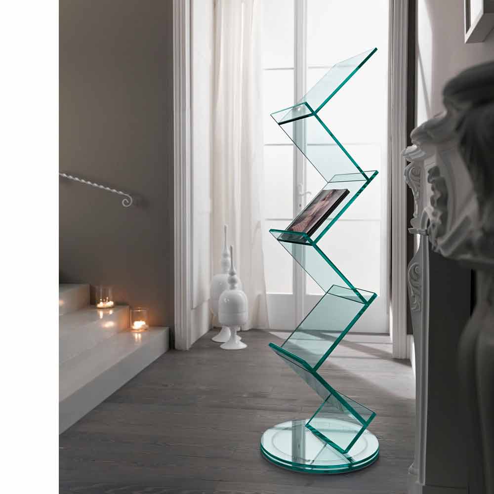 Dieses Zeitschriftenregal-Bücherregal zeichnet sich durch sein entschlossenes und elegantes Design aus, das vollständig aus transparentem Glas besteht.