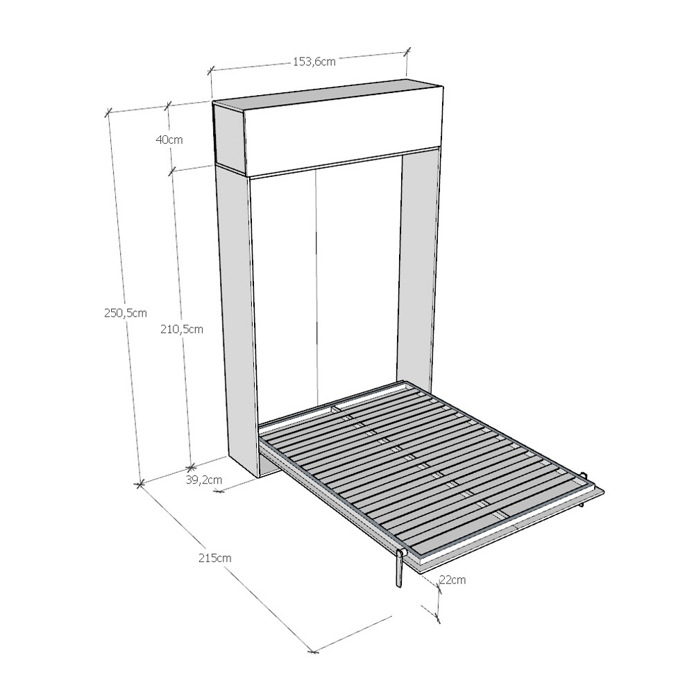 Der Bettrahmen besteht aus 18 mm dicken Melamin-Spanplatten und gewährleistet so Widerstandsfähigkeit und Langlebigkeit. Der Öffnungsmechanismus ist sanft und sicher und verwandelt die Wand mit einer einfachen Geste in ein bequemes Bett.