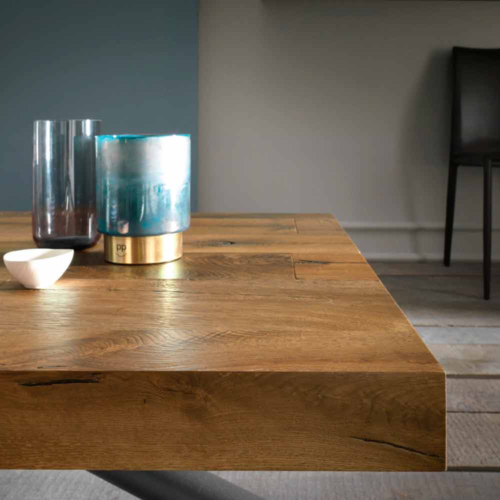 wandelbare Couchtisch vereint die Modernität des Konzepts und das verschlungene Design der Metallbeine mit dem natürlichsten und wertvollsten Teil der dicken Platte (8 cm) aus massiver Eiche.