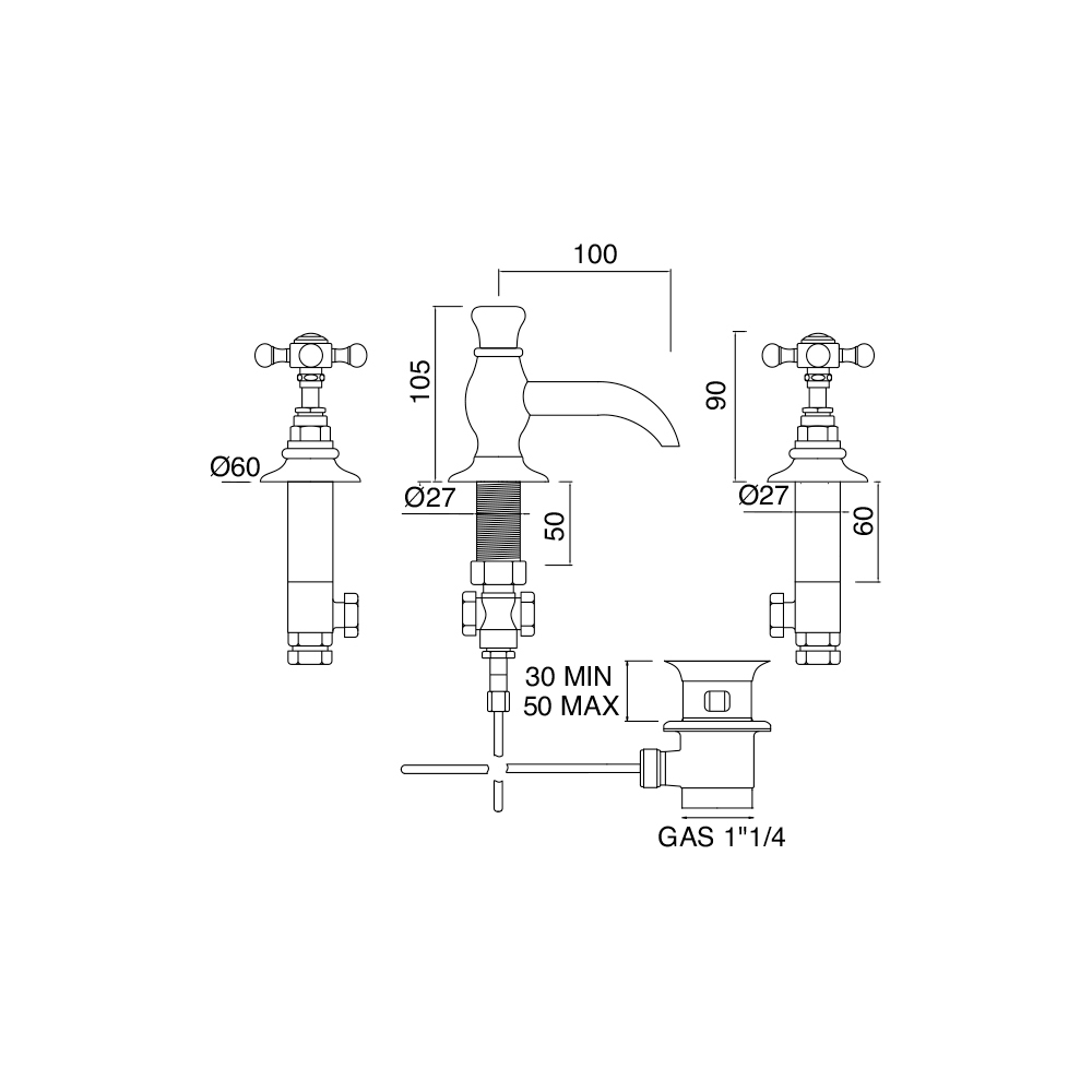 3-Loch-Waschtischarmatur für Vintage Design Messing Waschbecken Elisea, made in Italy.