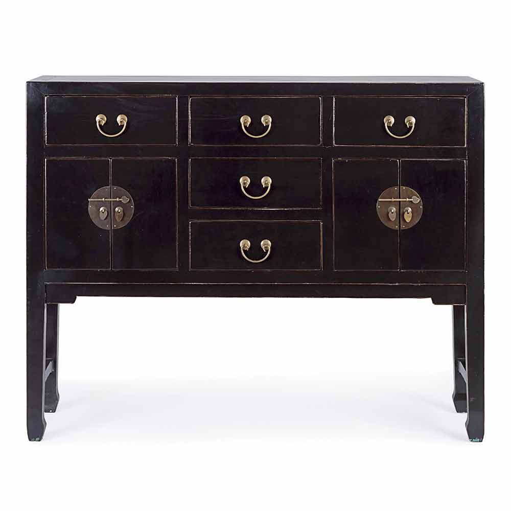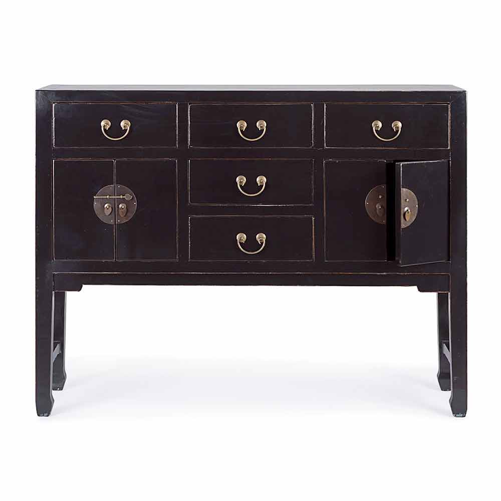 Schwarzer Konsolentisch aus Ulmenholz mit 5 Schubladen und 4 Türen im Vintage-Design.
