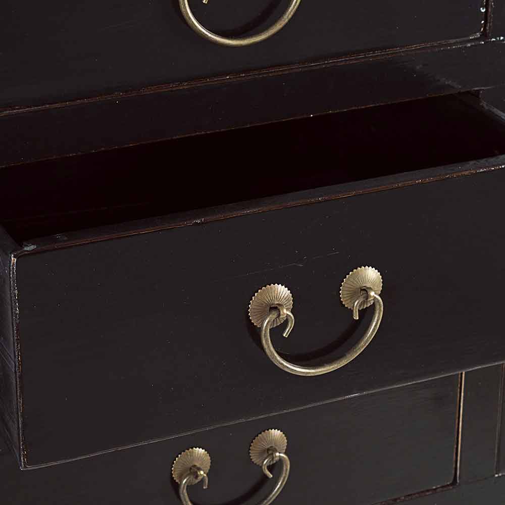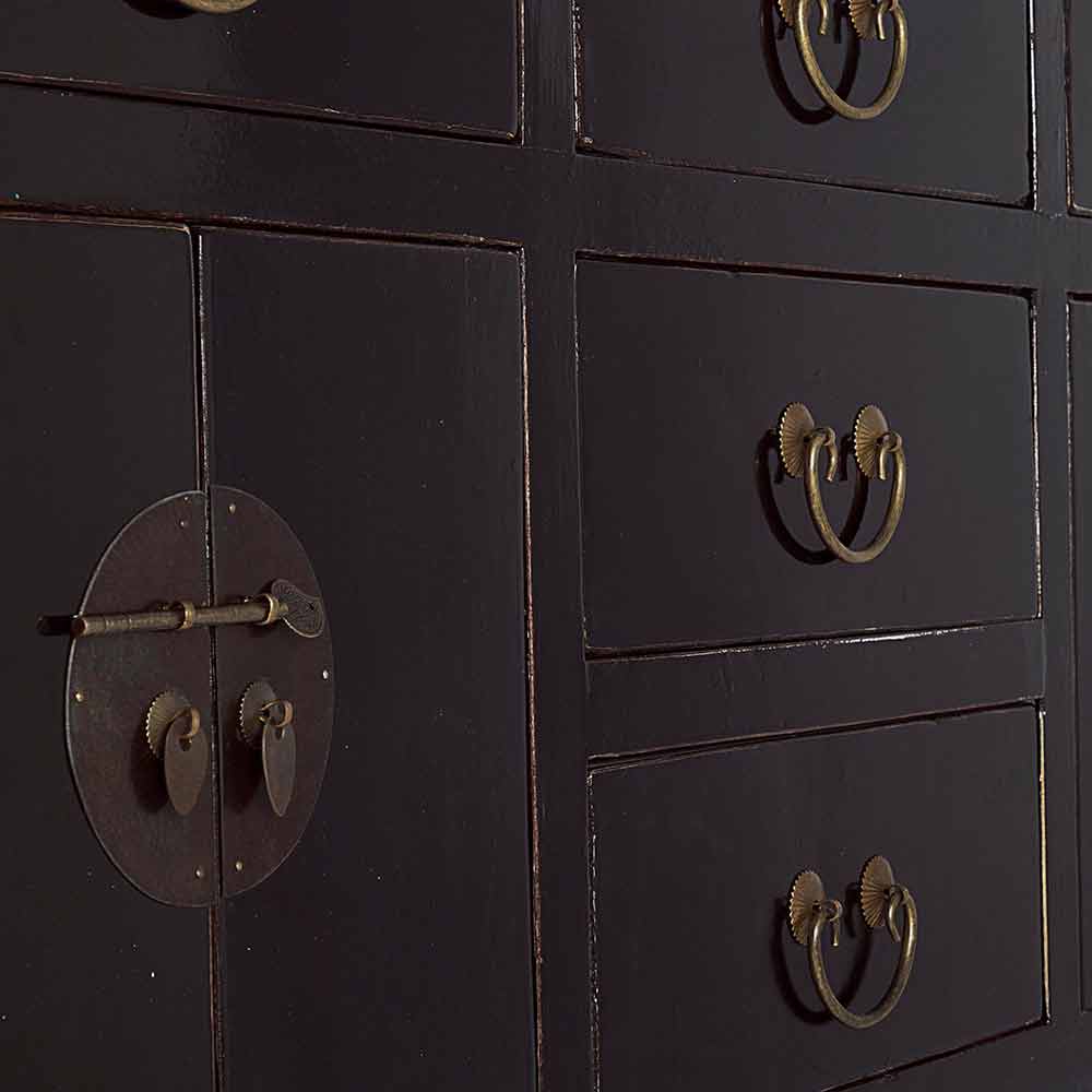 Mit 5 Schubladen und 4 Türen für eine geometrische und regelmäßige Zusammensetzung, das elegante Kupfer Greift die Szene vervollständigt, so dass ein perfekten Vintage - Stil zu schaffen, in der Lage zu geben , Luxus und Eleganz in jede Umgebung.