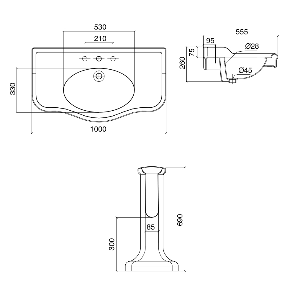 - L 100 x T 55,5 x H 69 cm mit Aufkantung und Aufkantung 1-3 Hahnlöcher - L 1000 mm;