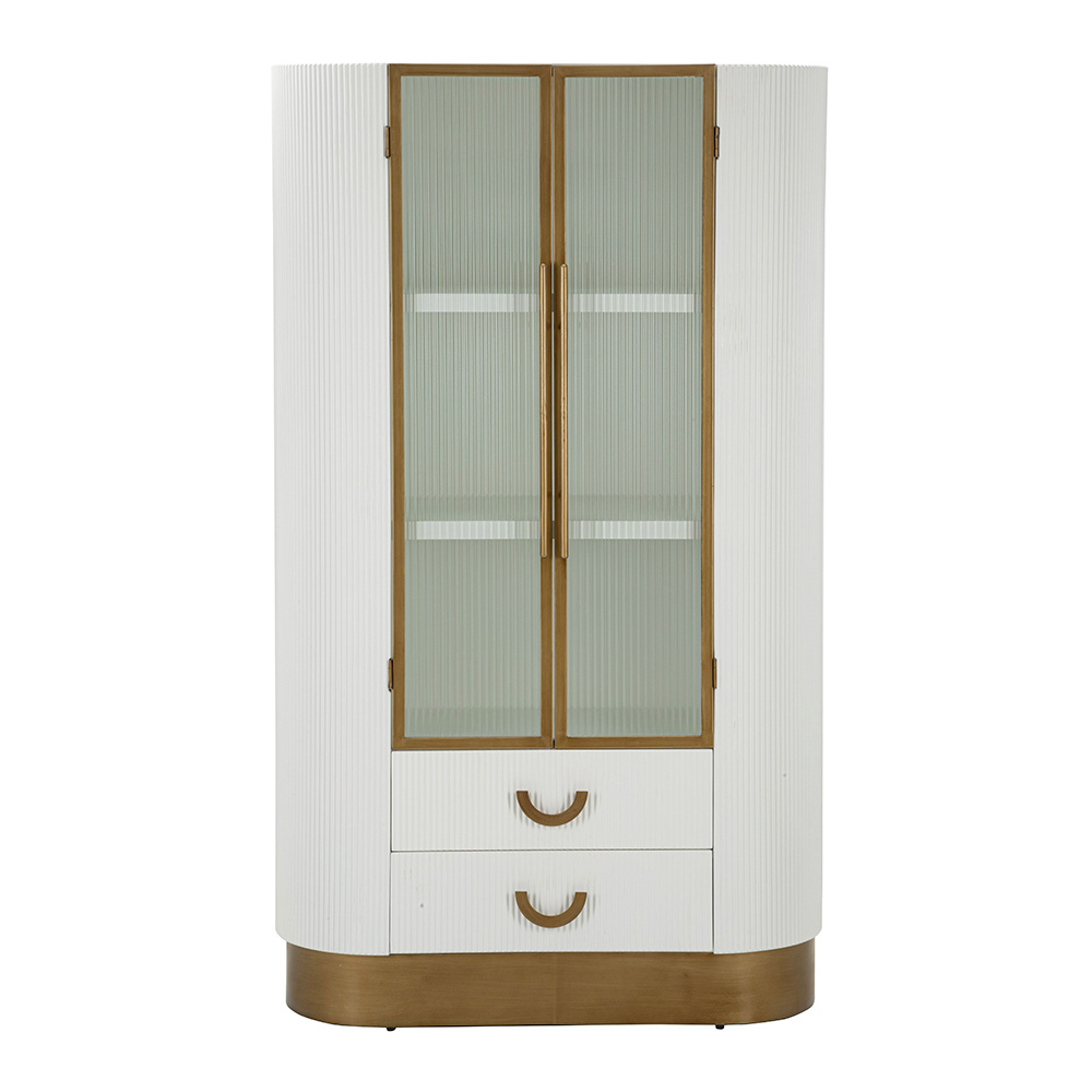 Das weiße Finish mit vertikalen Rillendetails verleiht einen Hauch von optischer Struktur und Tiefe , während die Linien des Sockels und der Griffe einen warmen Kontrast erzeugen, der das Möbelstück noch mehr aufwertet. Seine abgerundeten Formen verleihen Räumen eine einzigartige Weichheit und bieten gleichzeitig großzügigen Stauraum, der mit internen Regalen und geräumigen Schubladen praktisch organisiert ist.